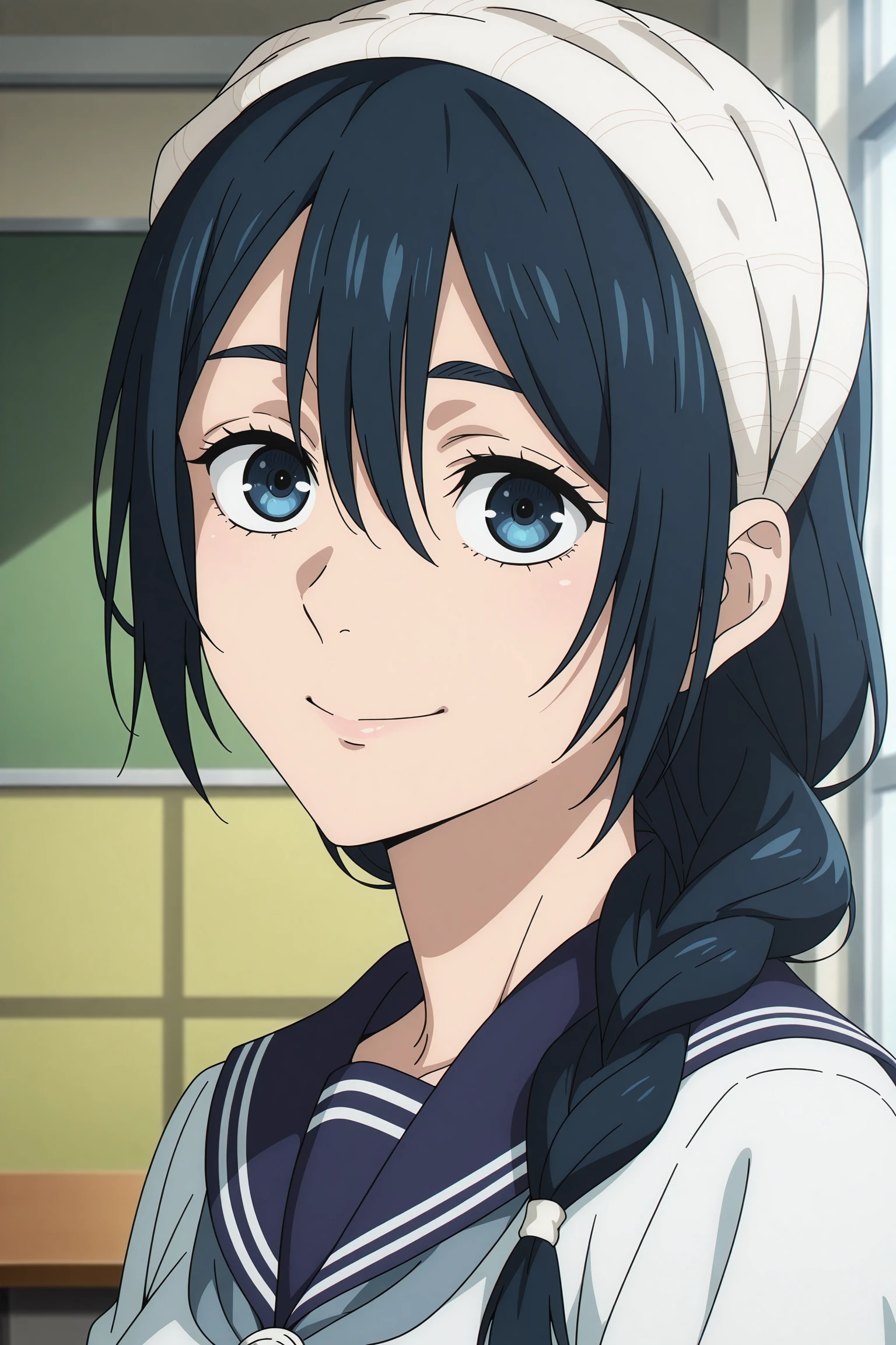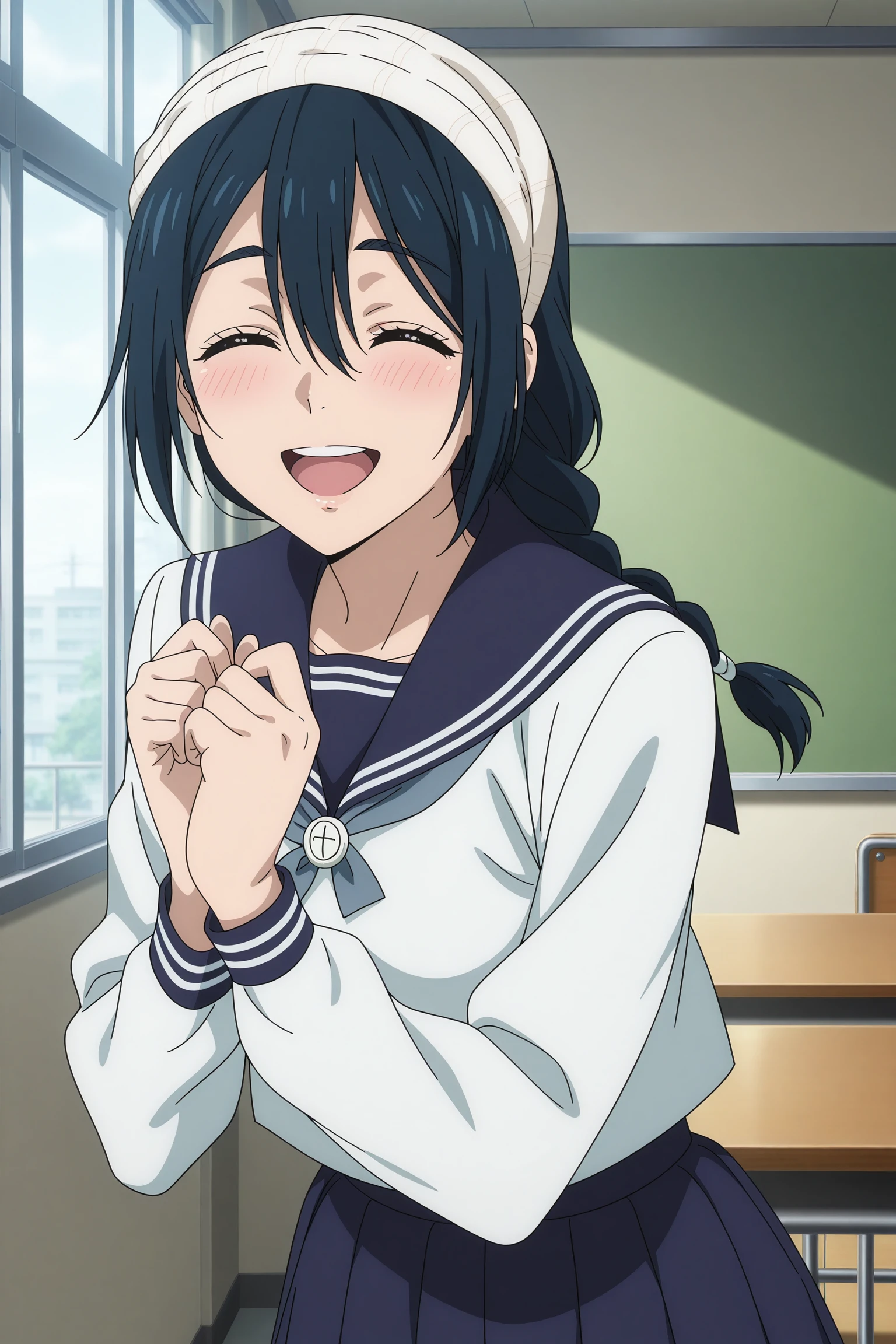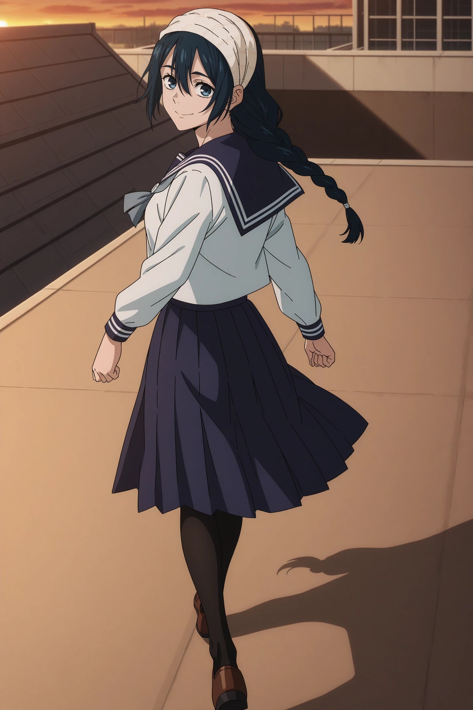 amanai riko, long hair, blue hair, long braid, braided ponytail, headscarf, sidelocks, hair between eyes, blue eyes, serafuku, long sleeves, white shirt, blue sailor collar, grey neckerchief, blue skirt, pleated skirt, black pantyhose, brown footwear, loafers