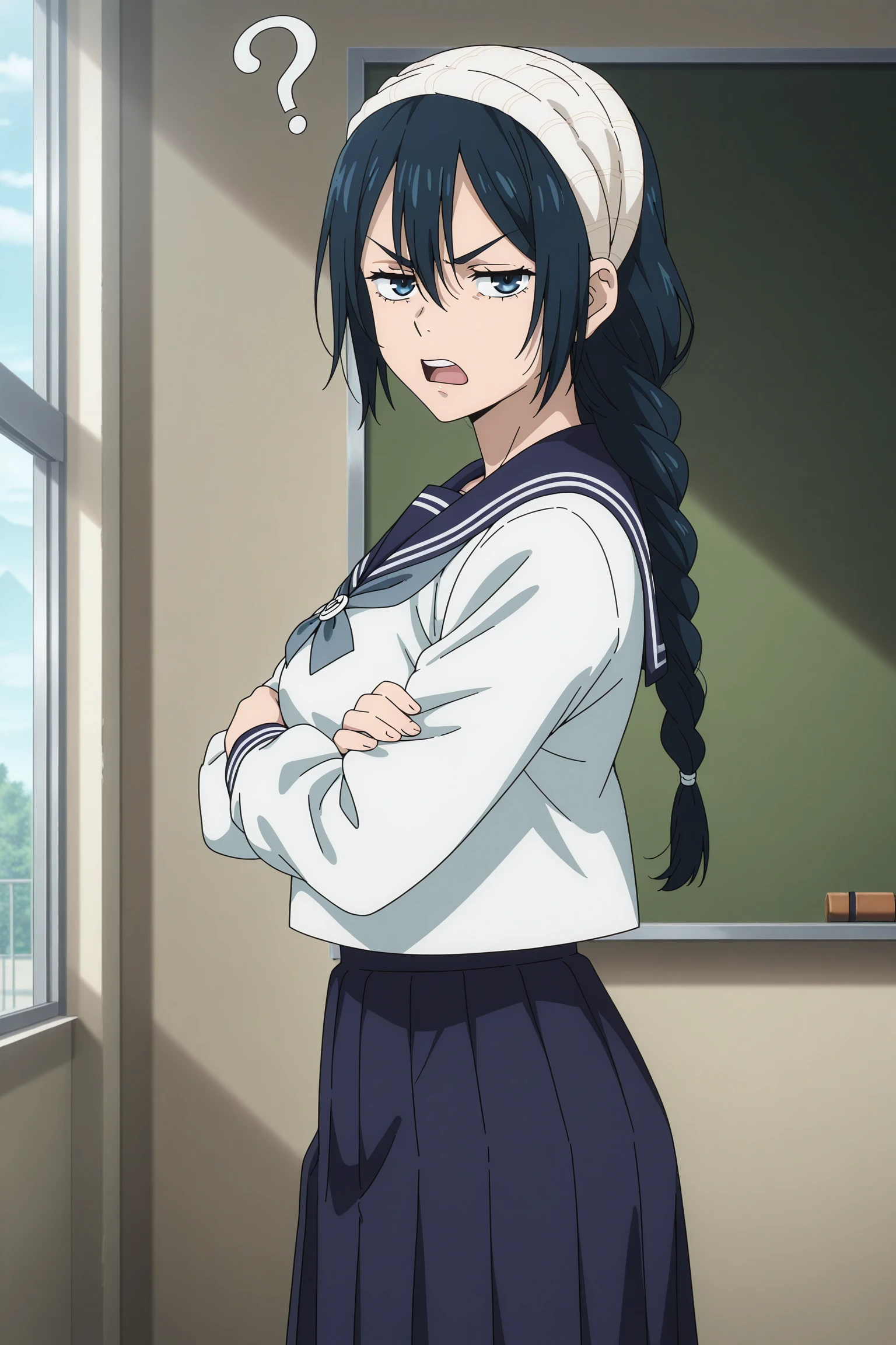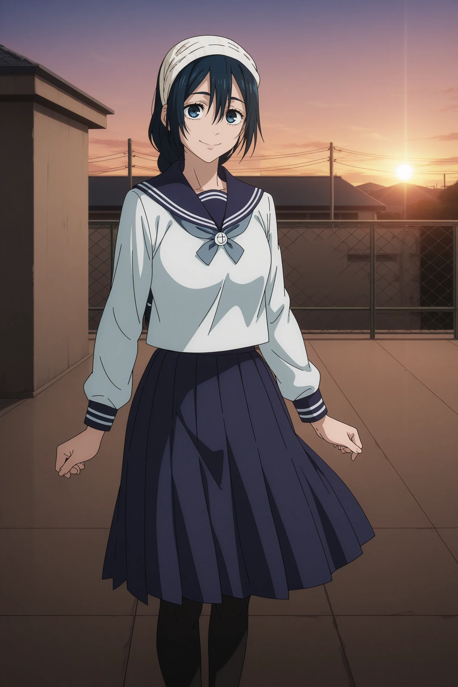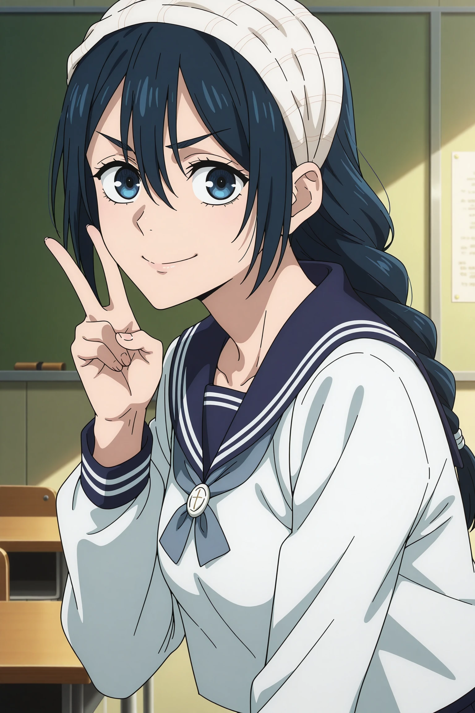 amanai riko, long hair, blue hair, long braid, braided ponytail, headscarf, sidelocks, hair between eyes, blue eyes, serafuku, long sleeves, white shirt, blue sailor collar, grey neckerchief, blue skirt, pleated skirt, black pantyhose, brown footwear, loafers