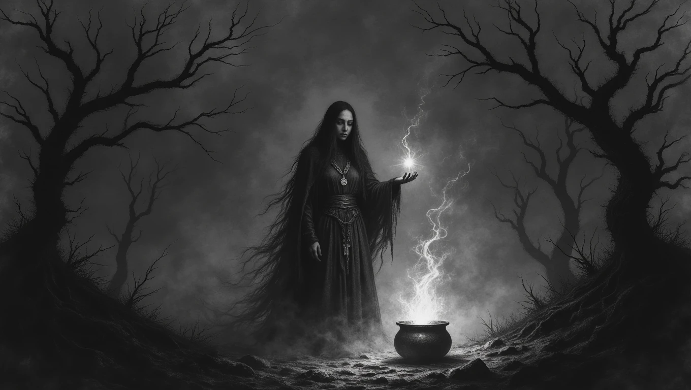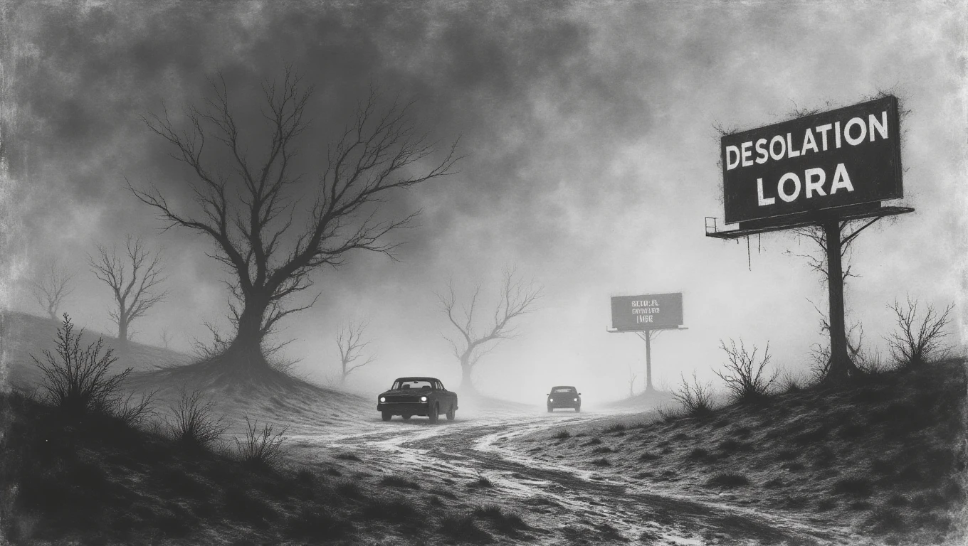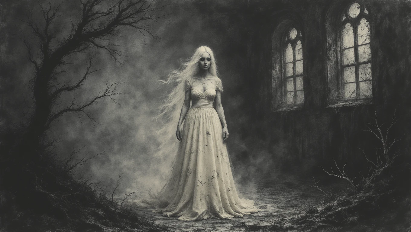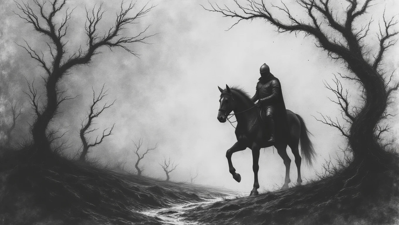 dark, moody, and gothic aesthetic. The black-and-white color palette enhances the bleakness of the scene, giving it a stark and eerie quality. The use of silhouetted figures, twisted barren trees, and a looming castle in the background suggests a feeling of isolation and foreboding. The misty atmosphere surrounding the central figure adds a layer of mystery, while the desolate landscape evokes themes of abandonment and darkness. The overall composition conveys a haunting beauty, where emptiness and solitude are dominant emotions.