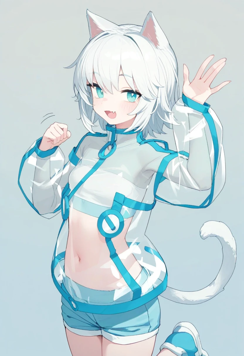 navel, jacket, tail, shorts, shoes, fang, midriff, see-through, maimai milk, maimai milk uni, animal ears, cat ears, cat tail, blue footwear, short hair, long sleeves, crop top, looking at viewer, blue nails, (((see-through jacket))), see-through sleeves, aqua eyes, white hair, cat girl, blue shorts
