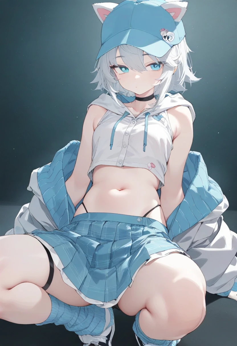 maimai milk, maimai milk bud,thighhighs, navel, underwear, panties, thighs, choker, midriff,drawstring,adapted costume, bare shoulders, baseball cap, black choker, black panties, blue eyes, blue hat, blue skirt, blue socks, ears through headwear, grey jacket, highleg panties, horizontal-striped thighhighs, hood down, loose socks, off shoulder, open clothes, plaid clothes, plaid skirt, ribbed socks, pleated skirt, short hair, striped thighhighs, thigh strap, string panties, striped clothes, sleeveless shirt
