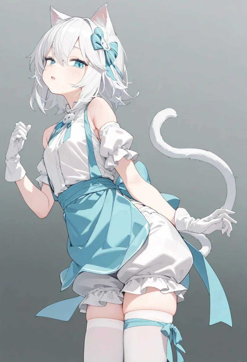 maimai milk, maimai milk dx,shirt, gloves, thighhighs, bow, ribbon, shorts, apron, , animal ears, aqua ribbon, blue eyes, bare shoulders, cat ears, cat girl, cat tail, hair bow, leg ribbon, puffy shorts, puffy sleeves, short hair, short sleeves, thigh ribbon, white gloves, white hair, white thighhighs, zettai ryouiki, white shirt, detached sleeves