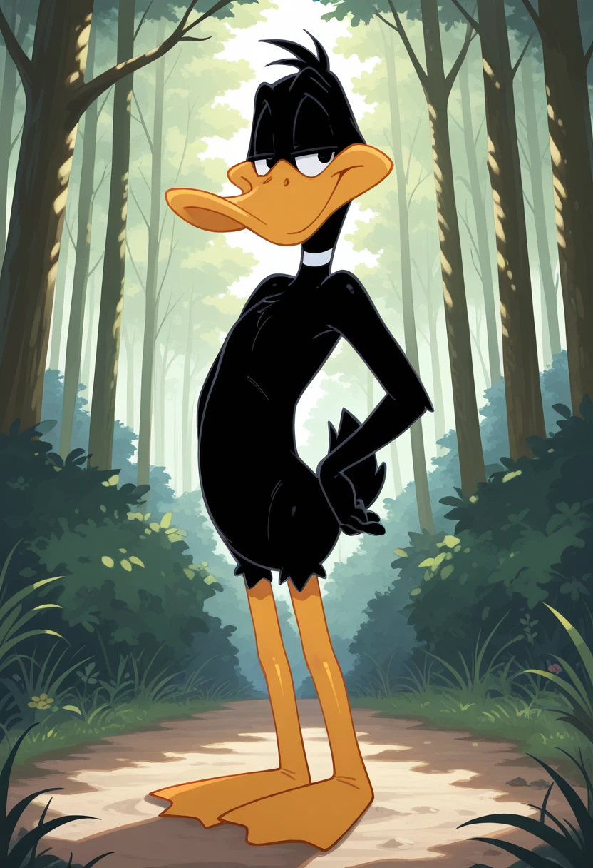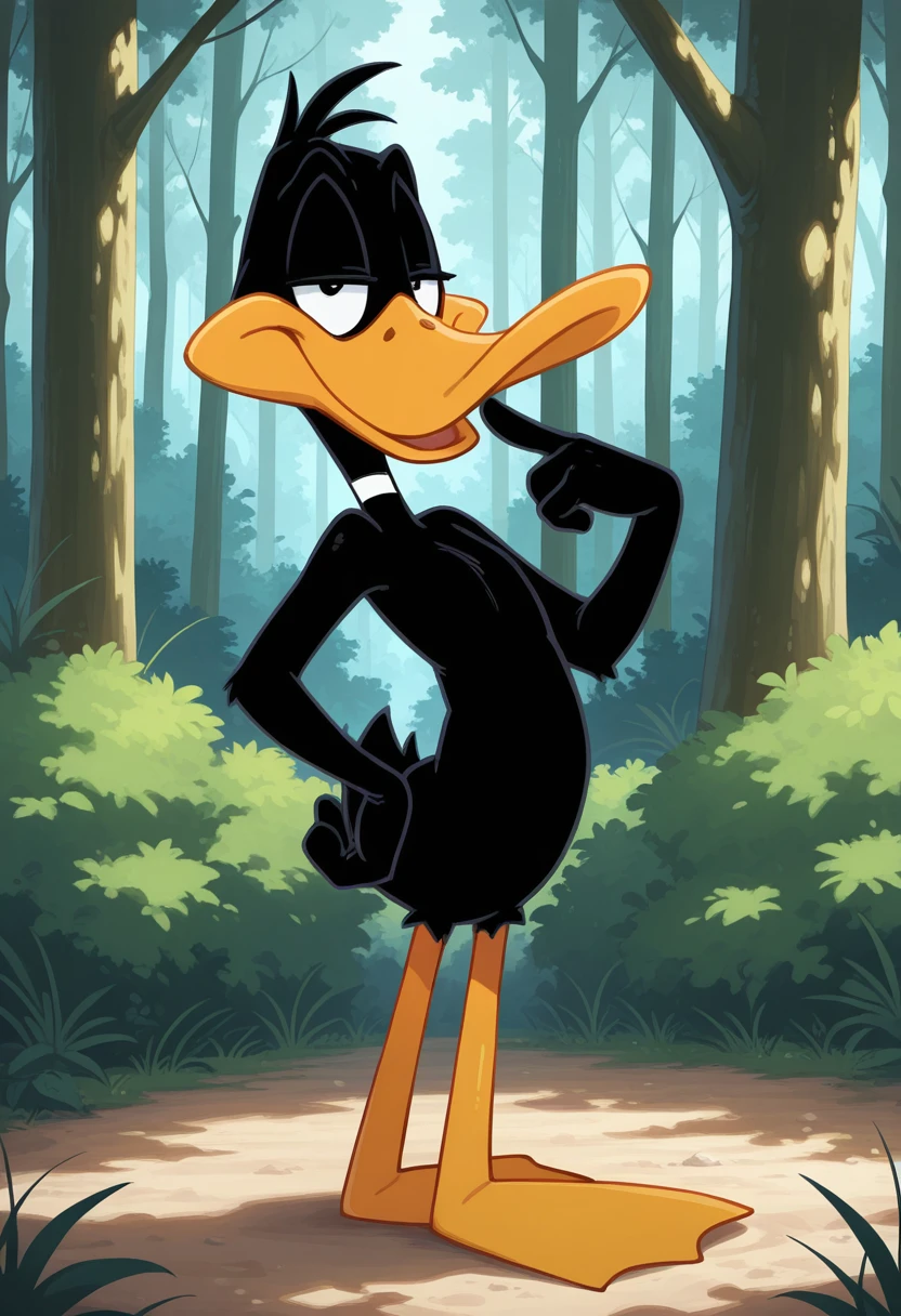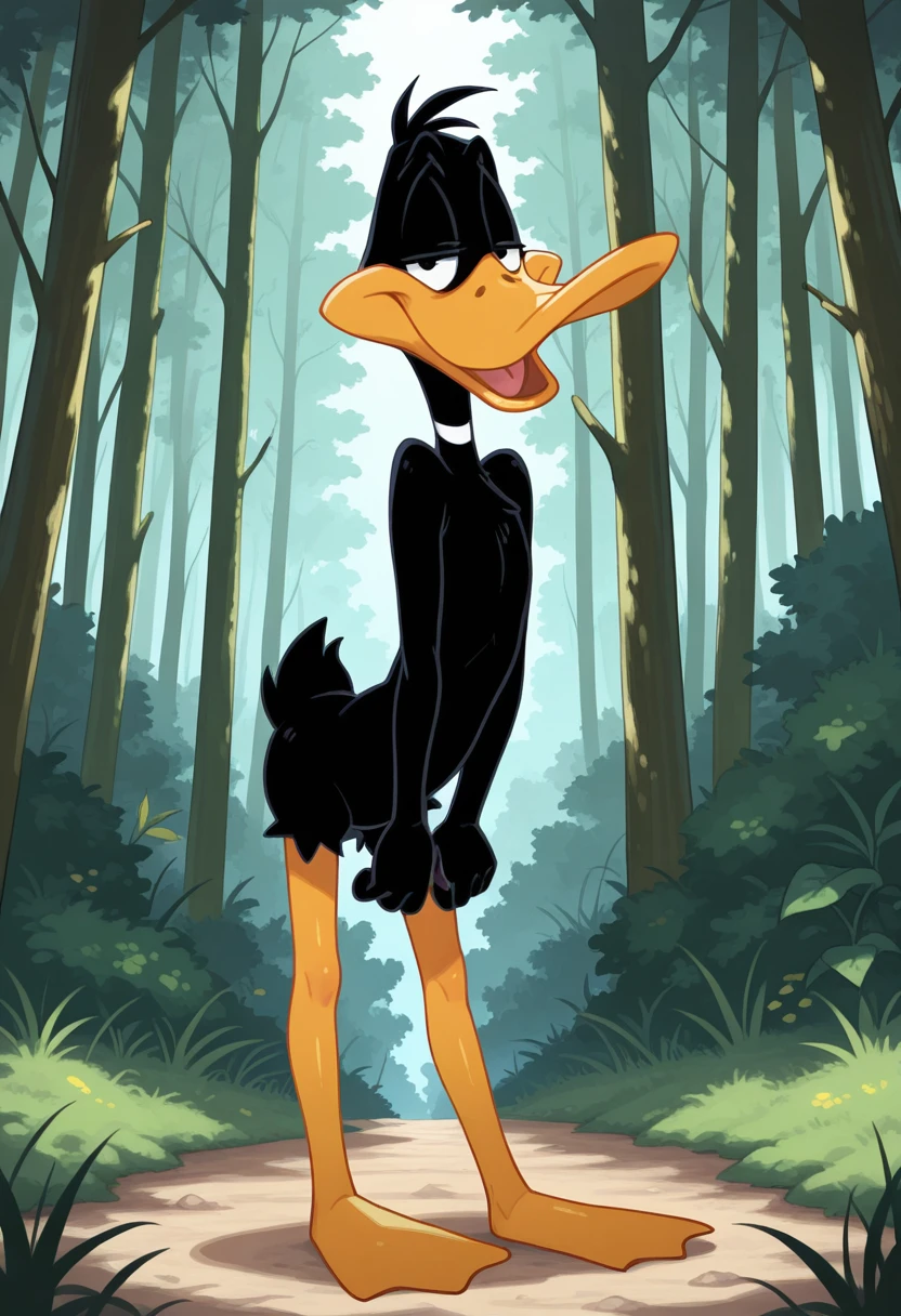 ( daffy duck), duck, black feathers, black body, orange bill, orange legs, black duck tail,