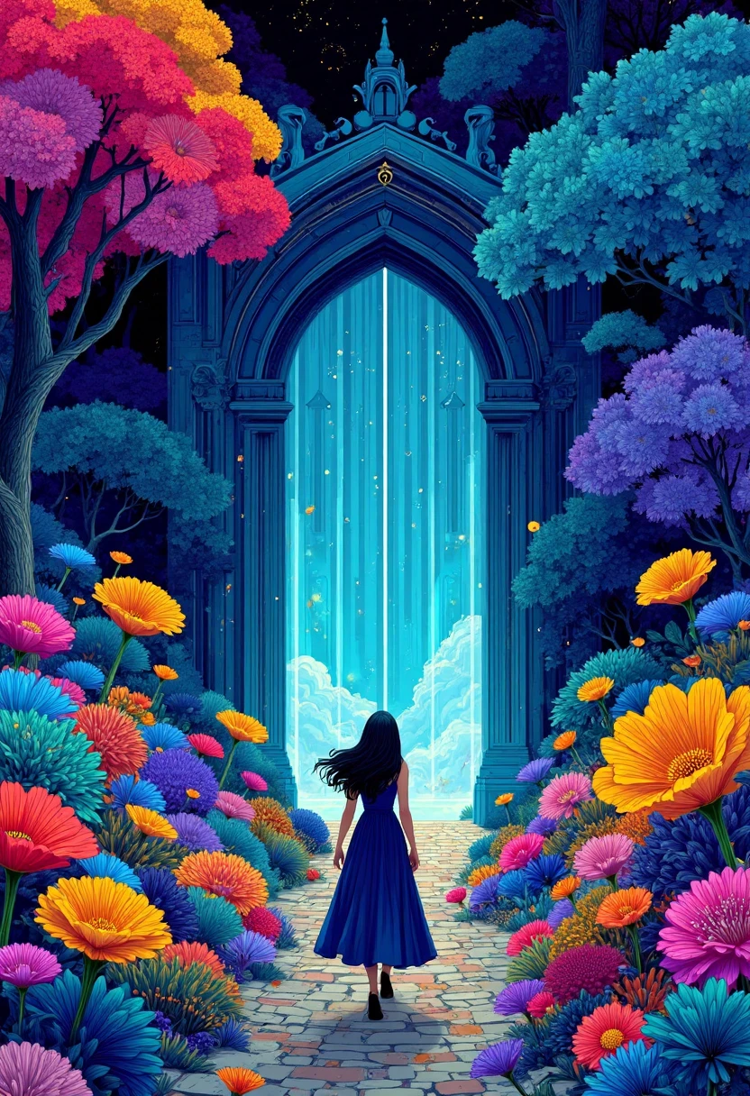 5. Rich colors and fantasy landscapes, a lone figure in a long dress walks towards a blue - lit gate, with various - colored flowers and plants, full of magic.