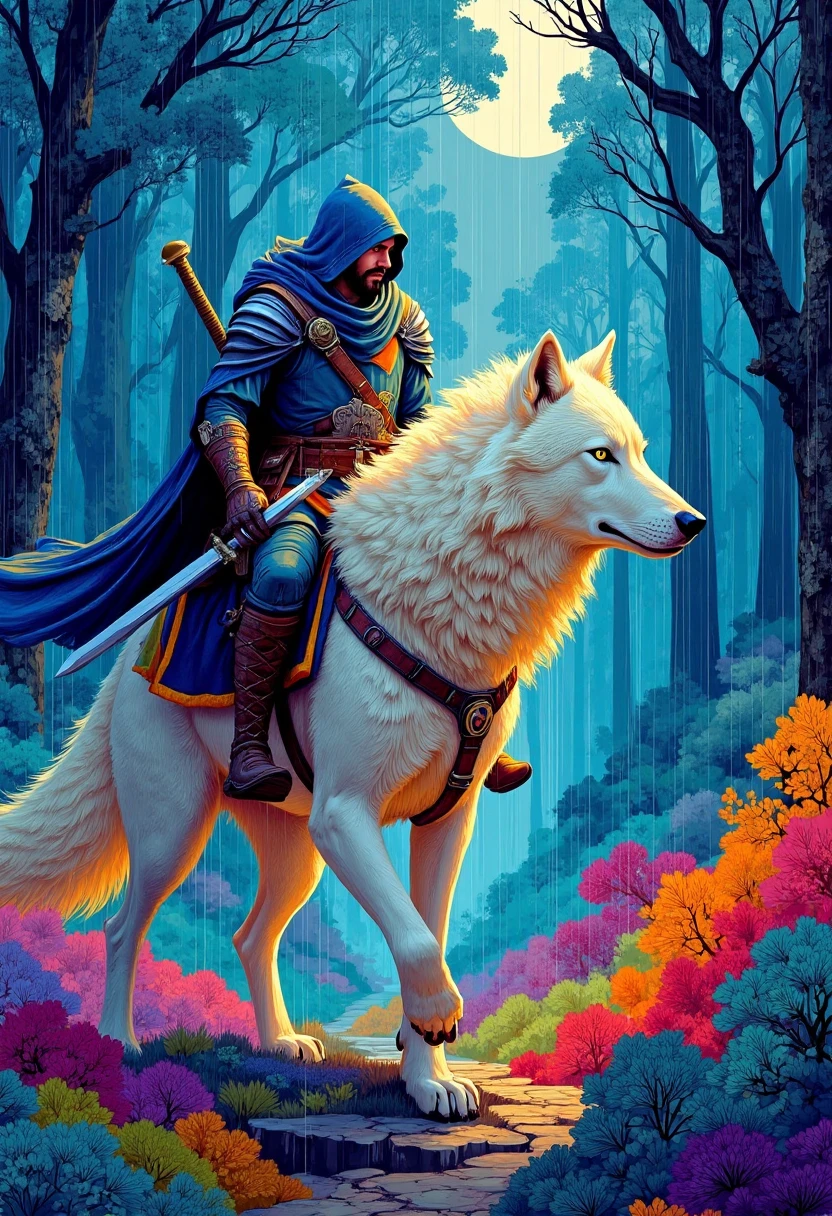6. Rich colors and fantasy landscapes, a warrior with a sword rides a white wolf in a rainy, colorful forest, the wolf's fur shining.