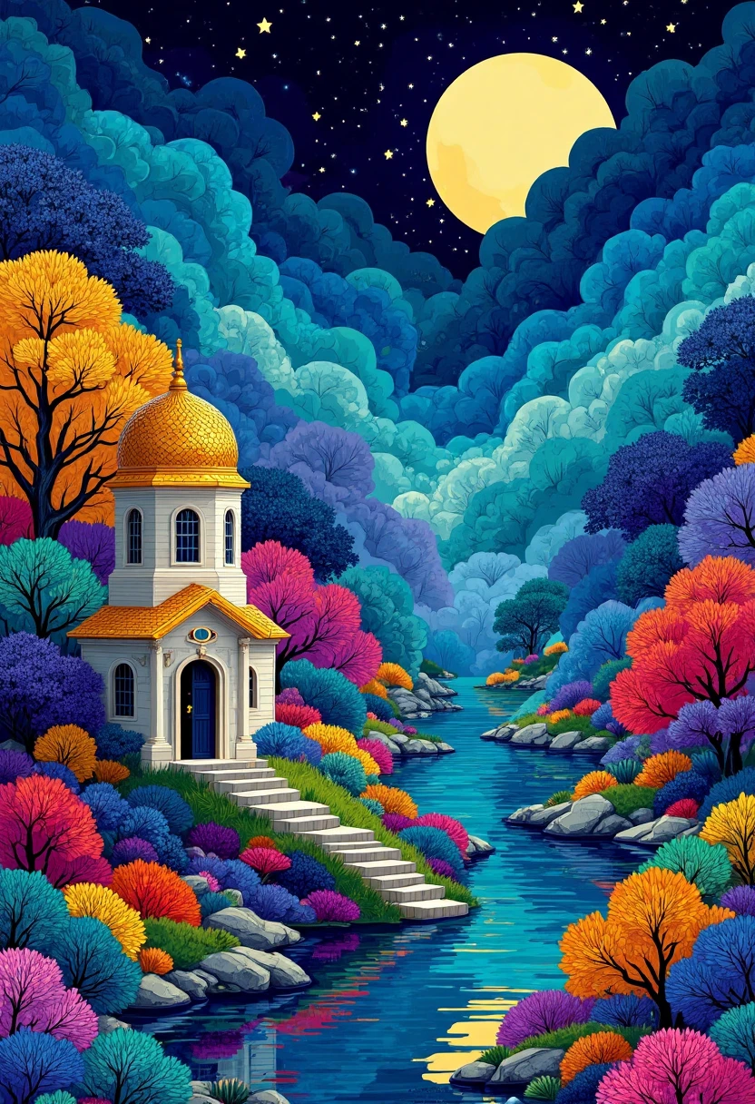 7. Rich colors and fantasy landscapes, a small building with a golden roof sits by a lake, colorful trees and a full moon, a peaceful fantasy place.