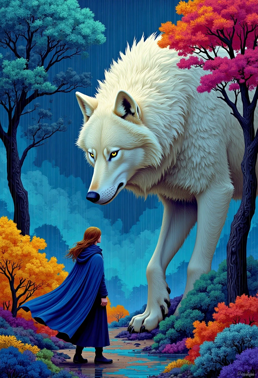 3. Rich colors and fantasy landscapes, a woman in a blue cloak faces a huge white wolf in a rainy forest, with bright - colored trees and a mysterious atmosphere.