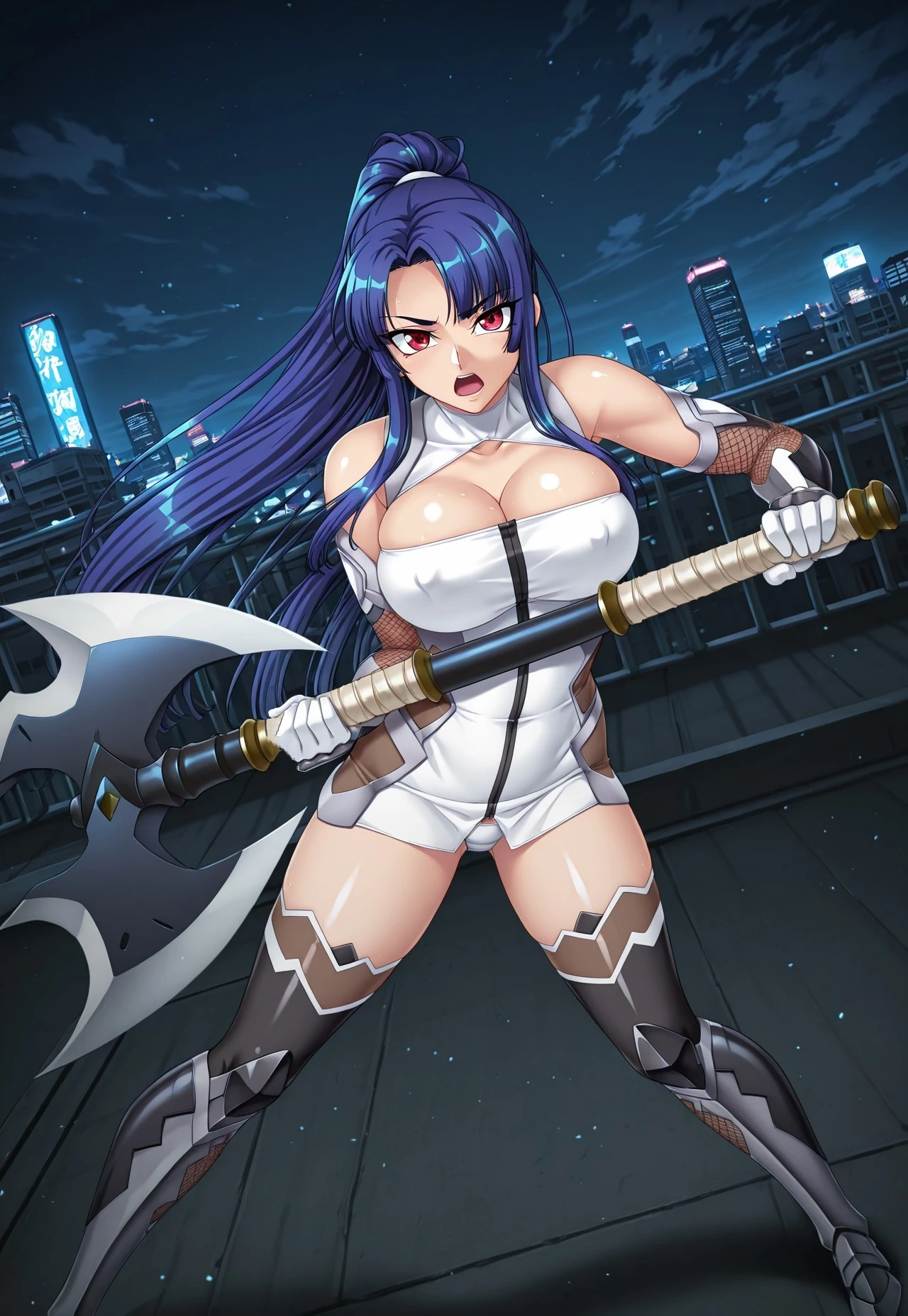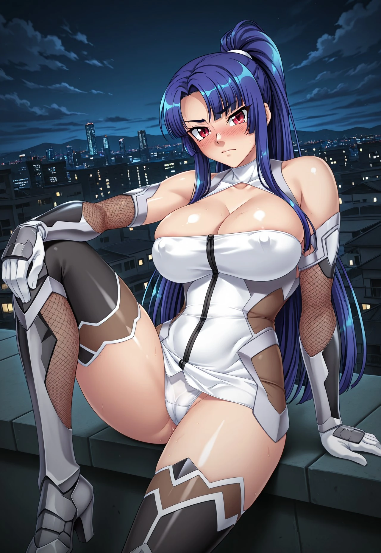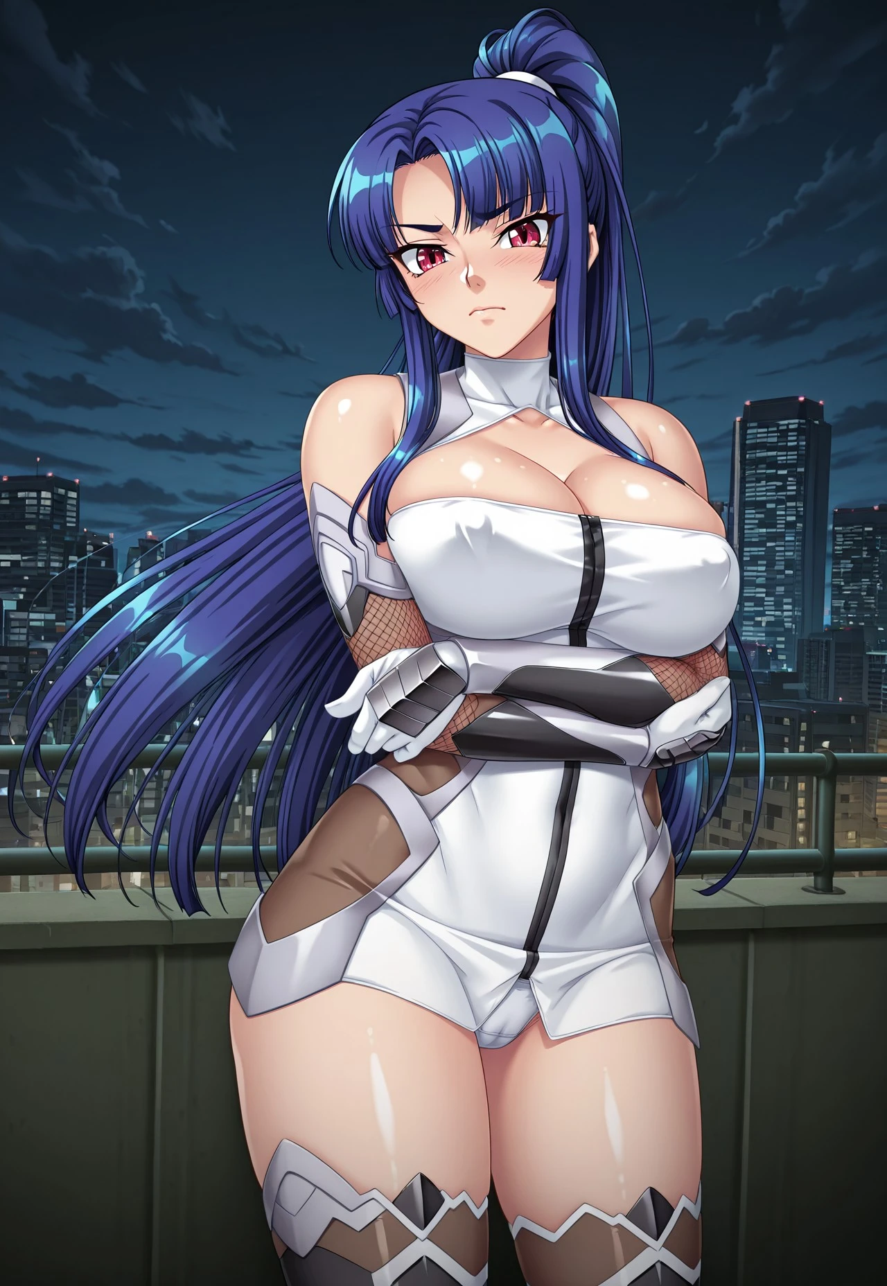 (TA3) 4th outfit: high ponytail, taimanin suit, white taimanin suit, bodysuit, short dress, skintight, turtleneck, collarbone, cleavage, bare shoulders, fishnets, fishnet elbow gloves, elbow gloves, gloves, covered navel, covered ????? ???????, white underwear, no bra, thighhighs, boots