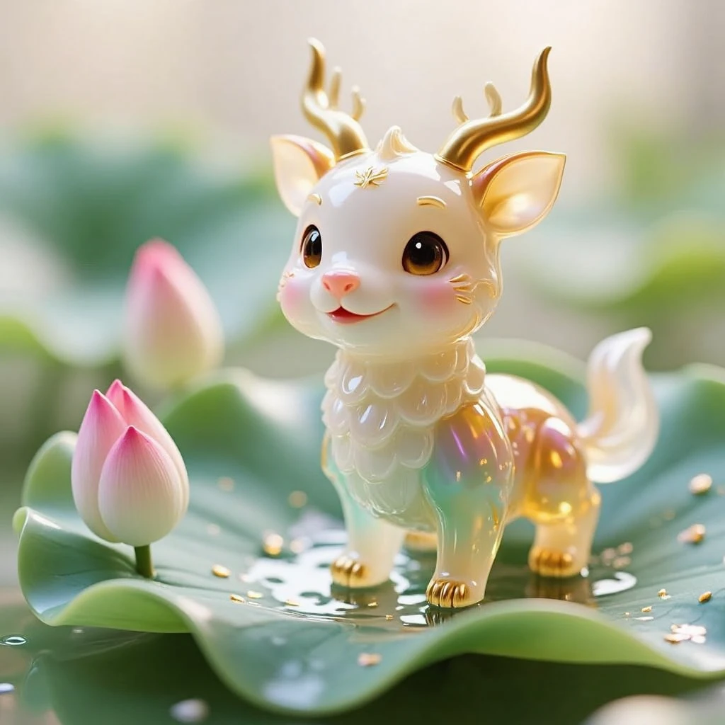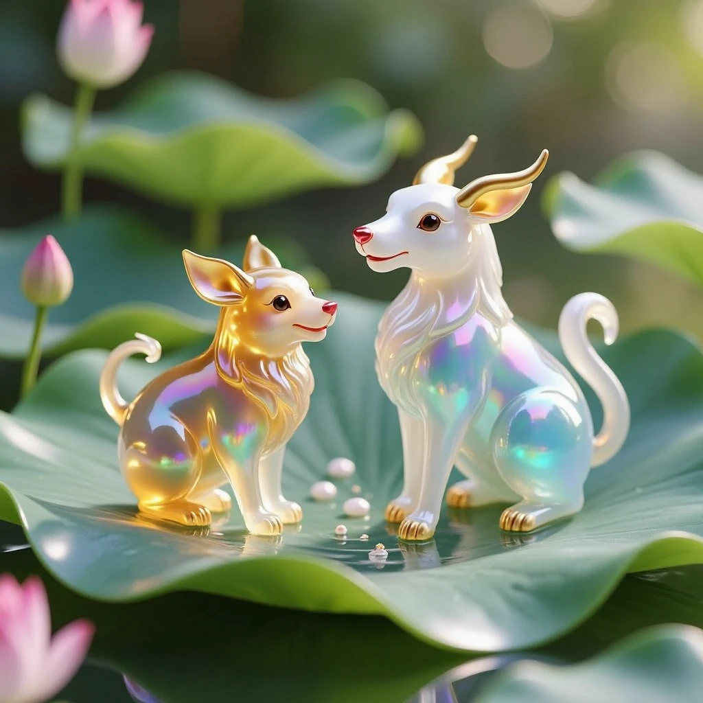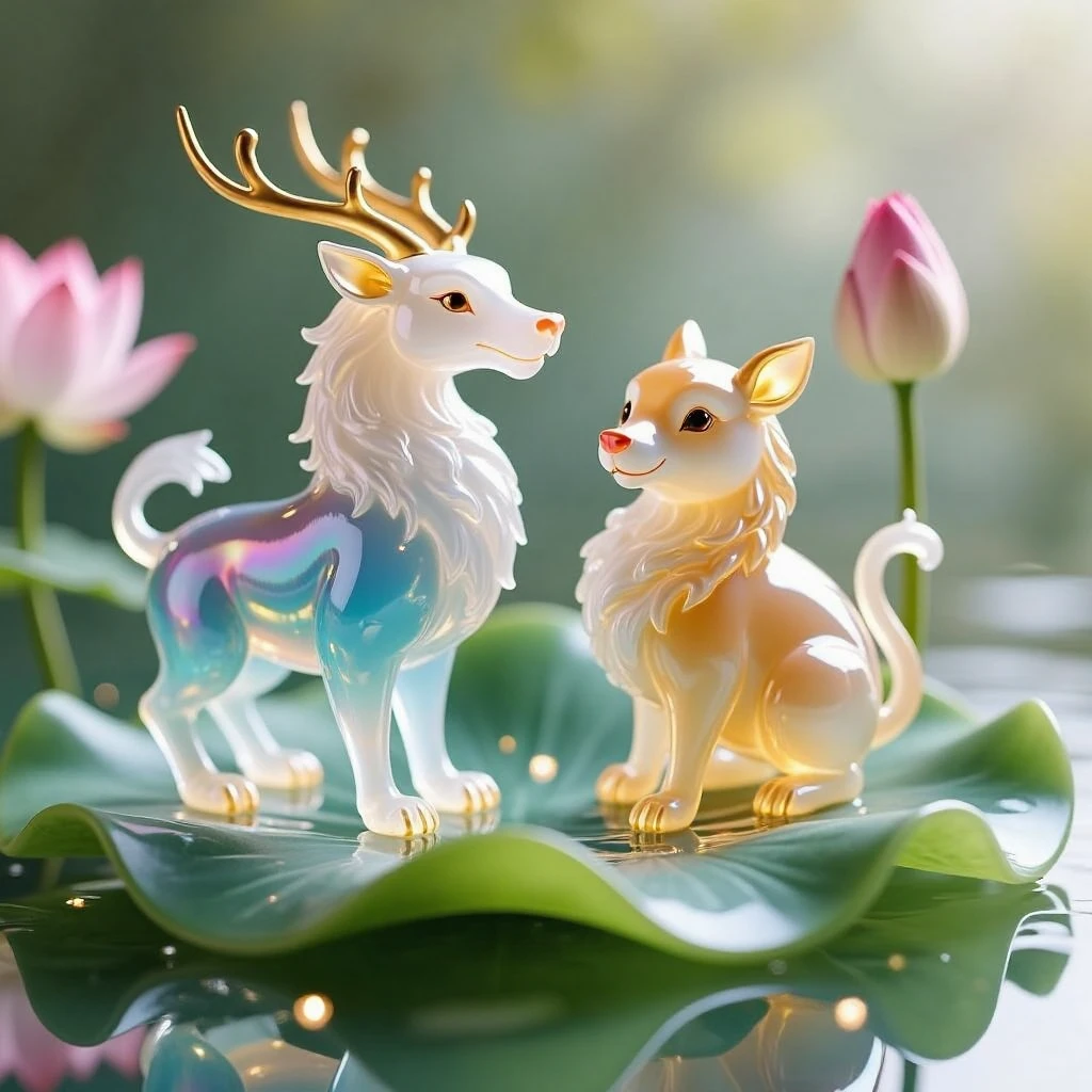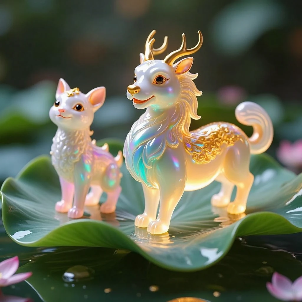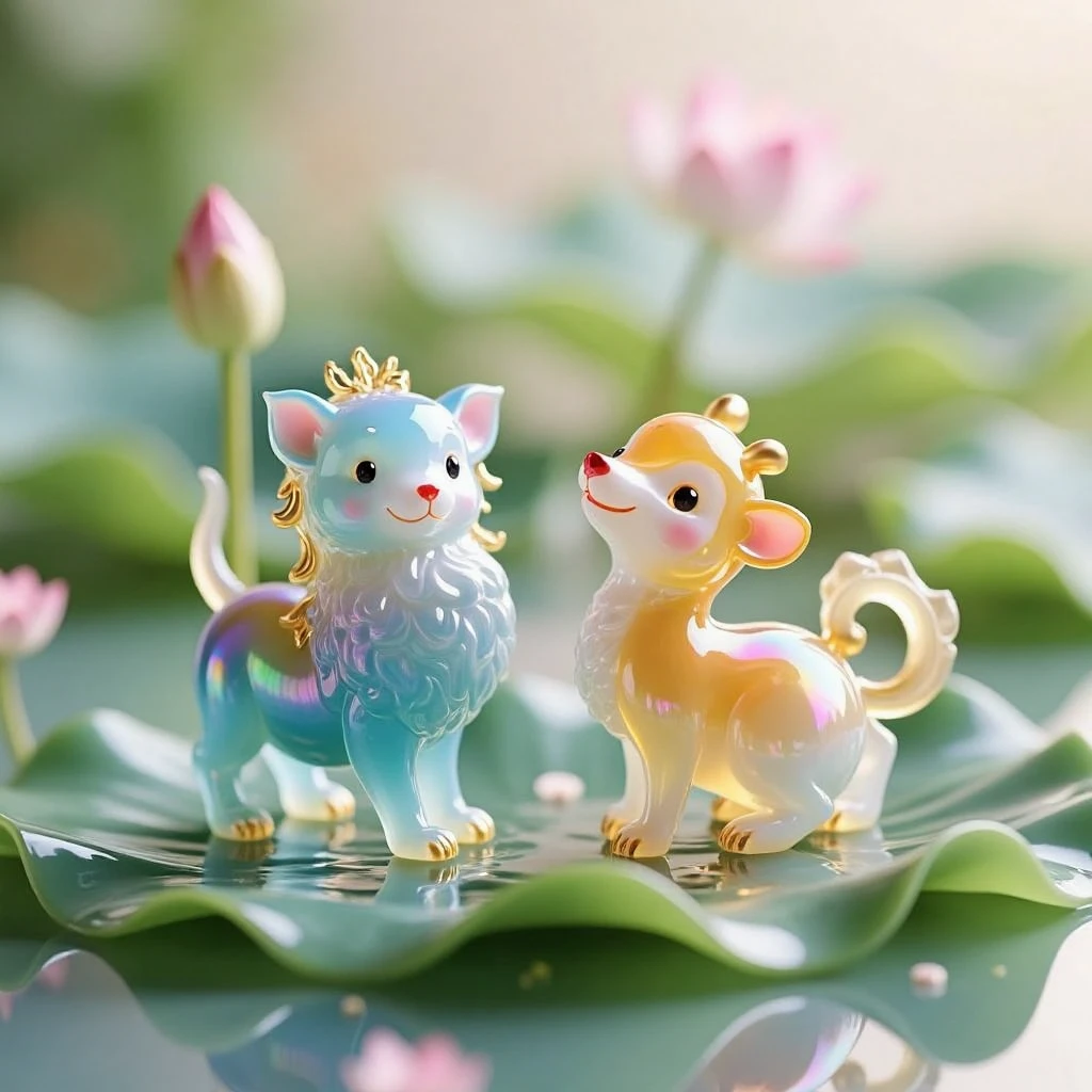 Chinese zodiac animal figures, translucent appearance, soft rainbow hues, set on jade - like lotus leaves adorned with tiny pink blossoms.