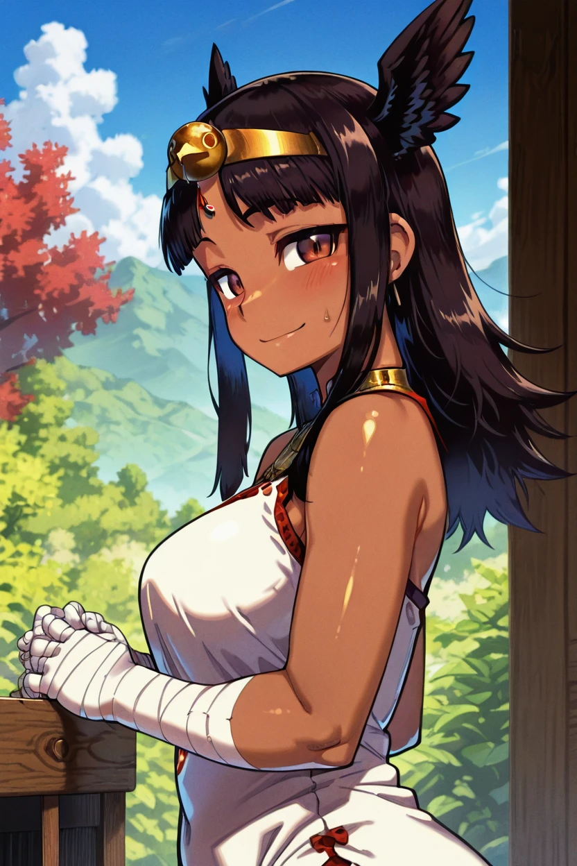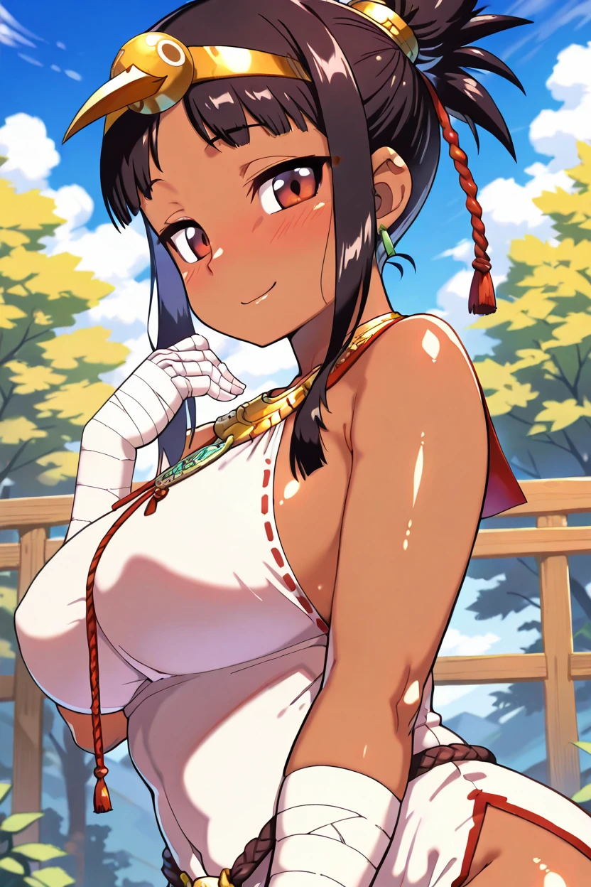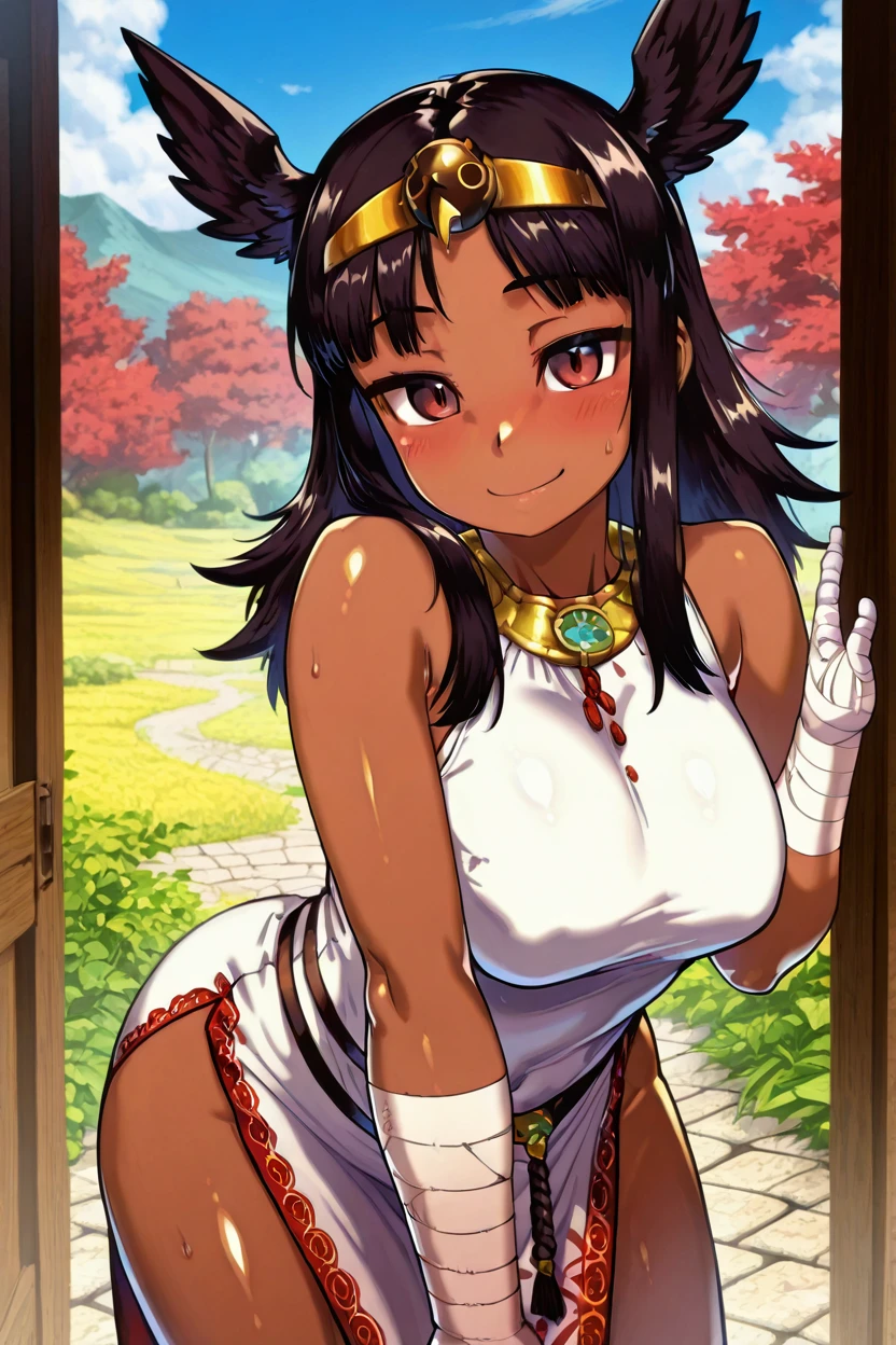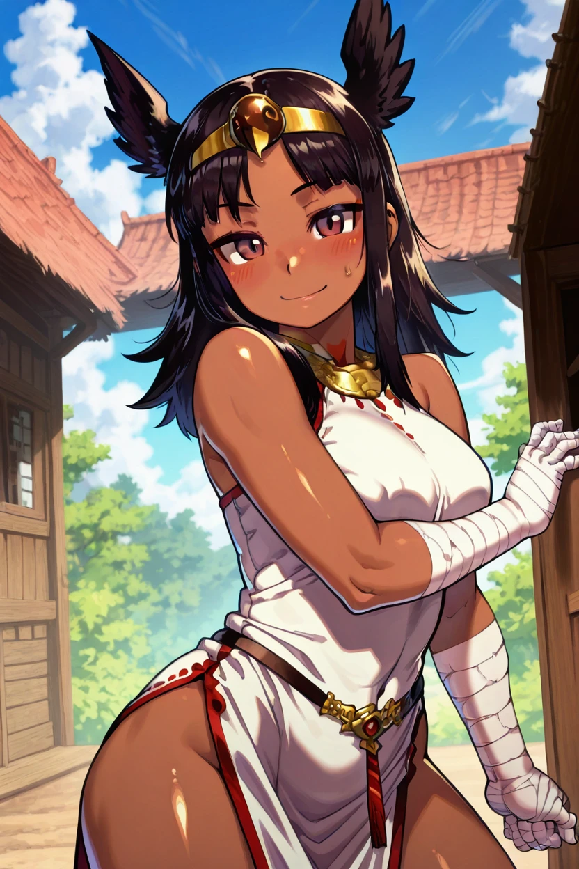 zzToto, dark skin, 1girl, blush, black hair, jewelry, bandages, white dress, sleeveless dress,