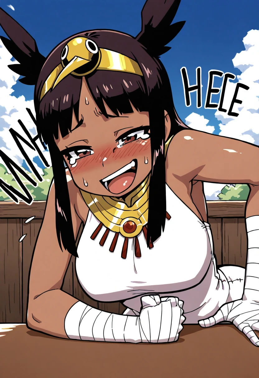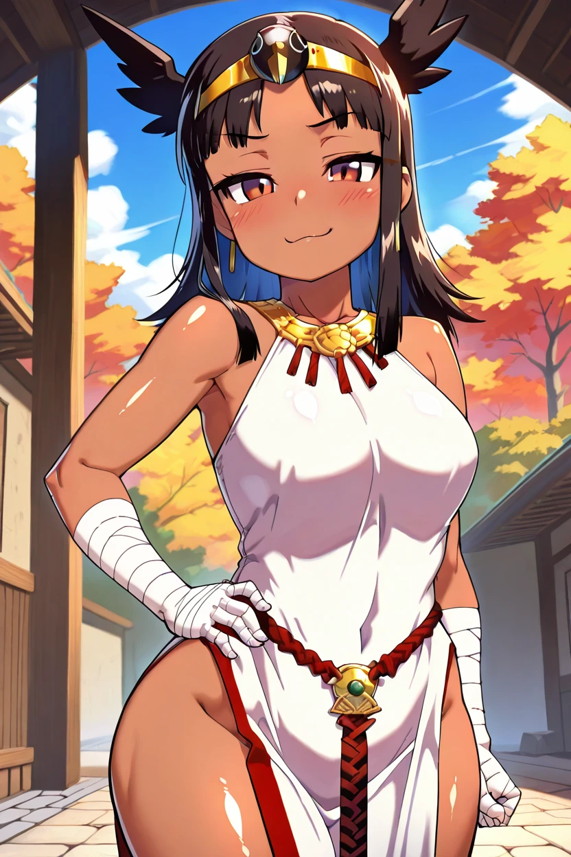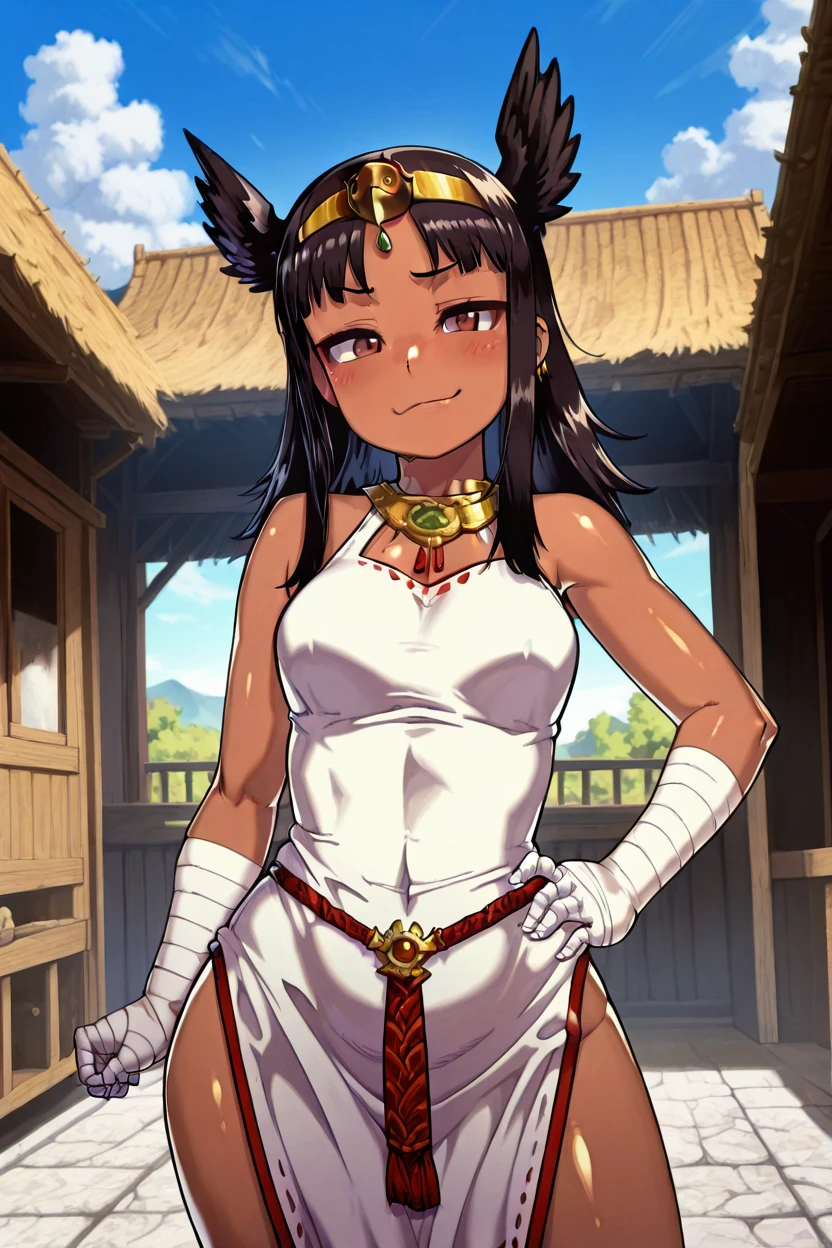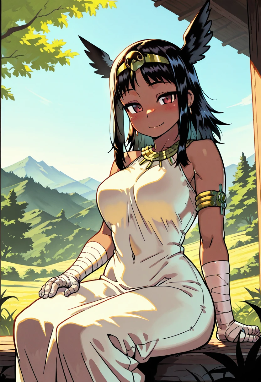 zzToto, dark skin, 1girl, blush, black hair, jewelry, bandages, white dress, sleeveless dress,