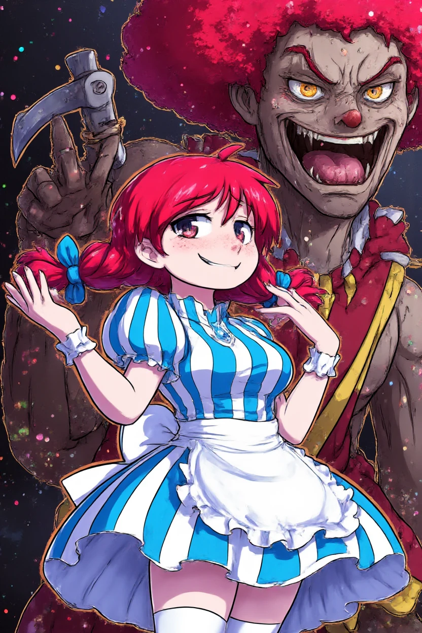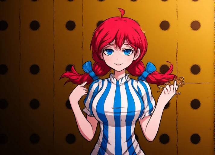 Standard outfit: Wendy Thomas has red hair styled in pigtails with blue bows at the end of her braids. She is wearing a white and blue striped dress with puffed sleeves. She is also wearing red and white striped thigh high socks. Wendy is smiling smugly.