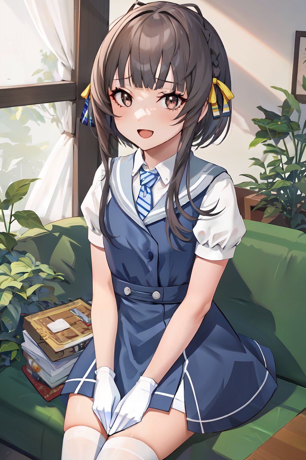 UkuruKC, (Ukuru) dress, (blue) dress, (white) shirt, (yellow) hair ribbon, (grey) sailor collar, (striped) necktie, (white) thighhighs, (white) gloves, (black) mary janesSpecial outfits