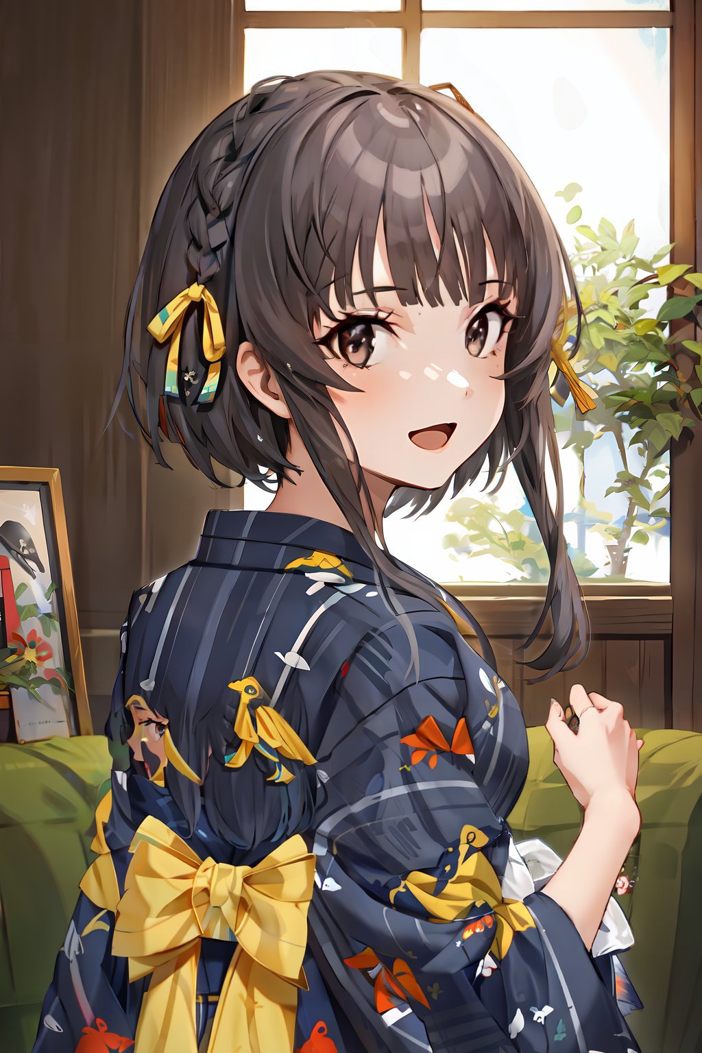 -gift box, holdingUkuruKC, (Ukuru) kimono, (blue) kimono, (yellow) hair ribbon, (yellow) obi, sandals