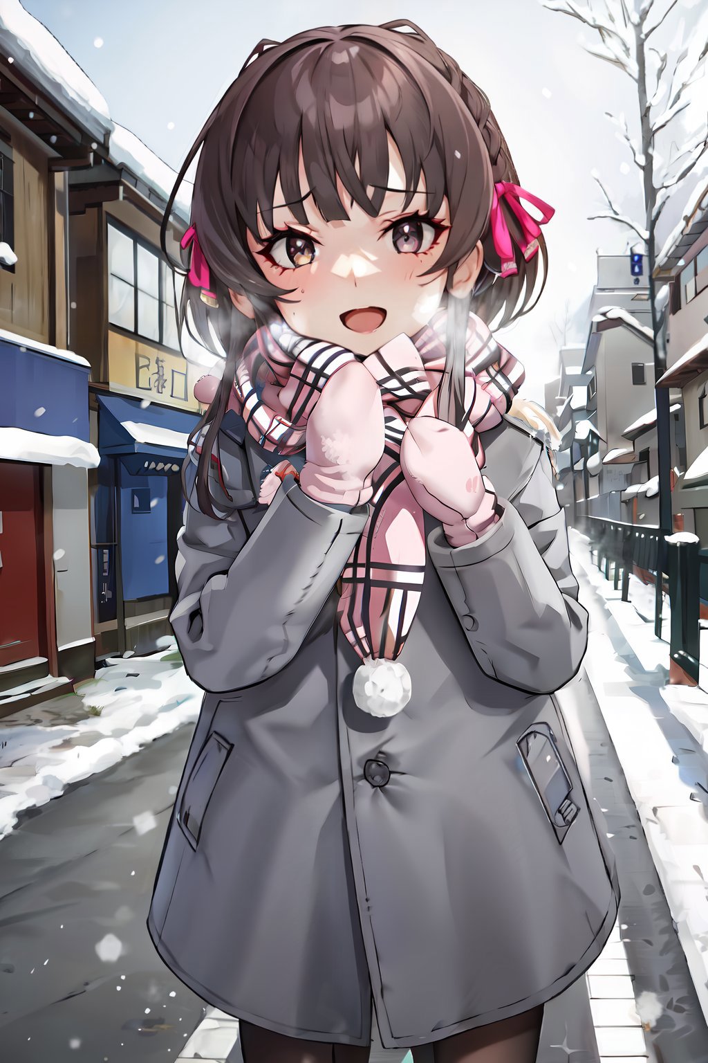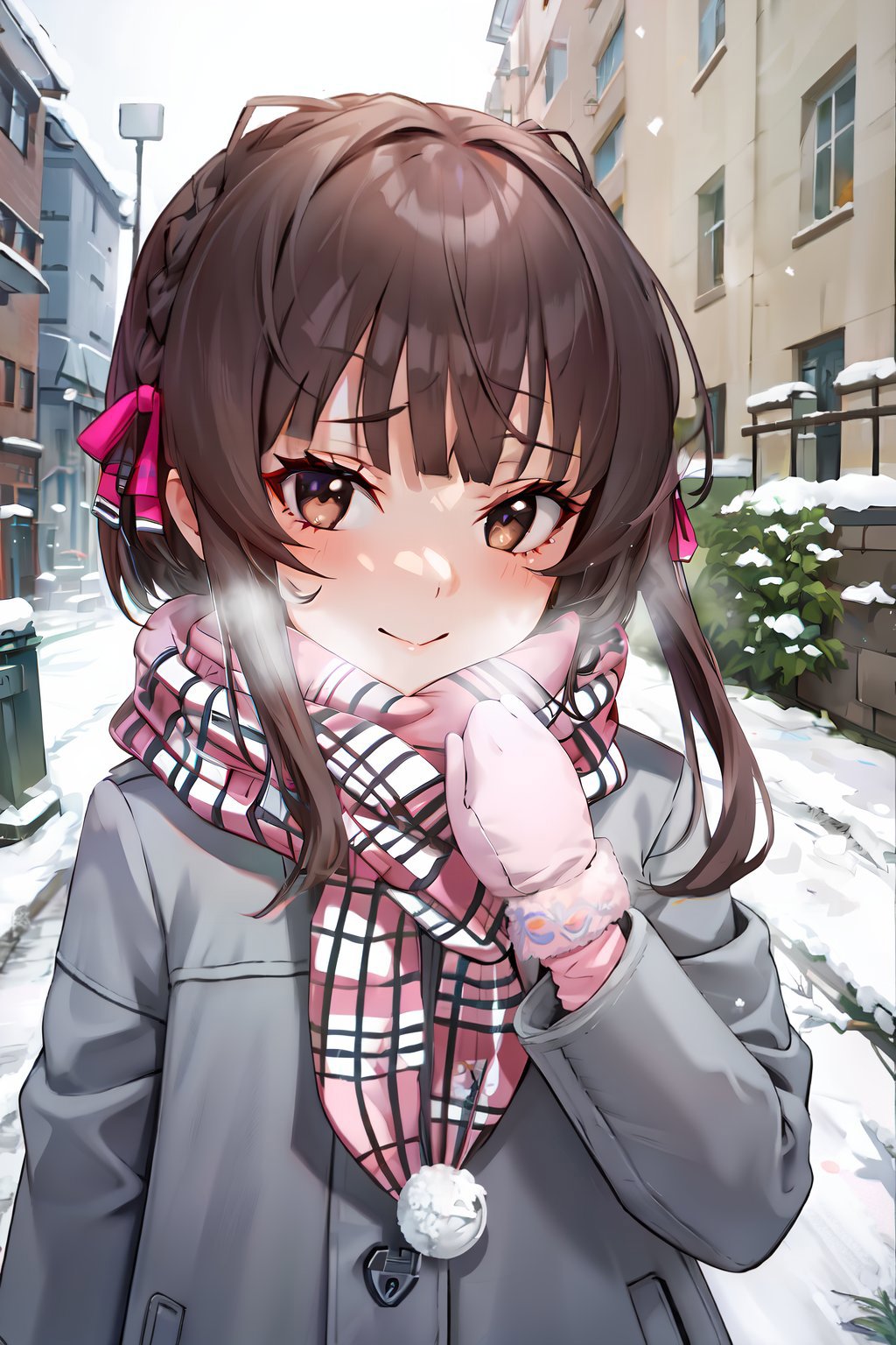 UkuruKC, (Ukuru) coat, (grey) coat, (pink) hair ribbon, (plaid) scarf, (pink) mittens, (white) pantyhose, (black) mary janes