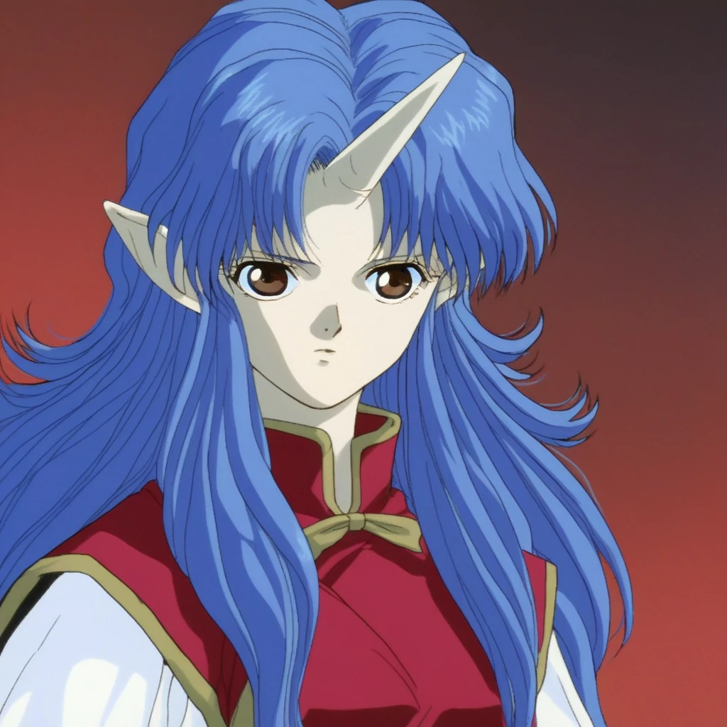 miyuki, blue hair, long hair, brown eyes, pointy ears, single horn