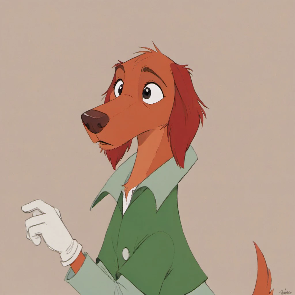 Shamus, dog, Irish Setter, anthropomorphic dog, cartoon dog, animal ears, long ears, floppy ears, red ears, orange fur, black eyes, brown nose, long snout, green cloak, green suit, white gloves, dark green top hat, Disney,