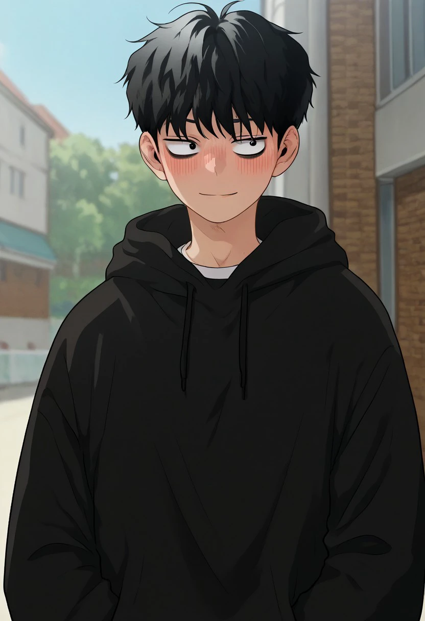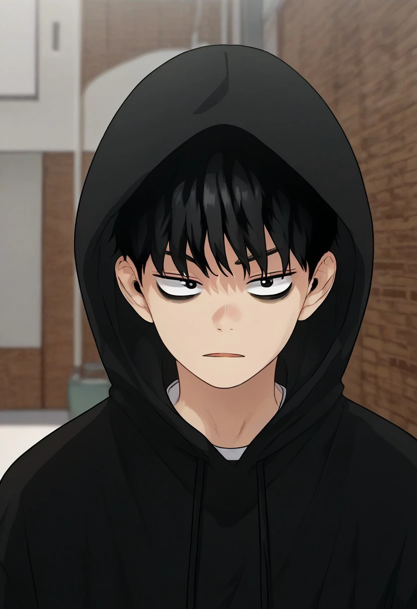 Yongjin, 1boy, male focus, solo, black hair, short hair, black eyes, bags under eyes, hoodie, black hoodie,