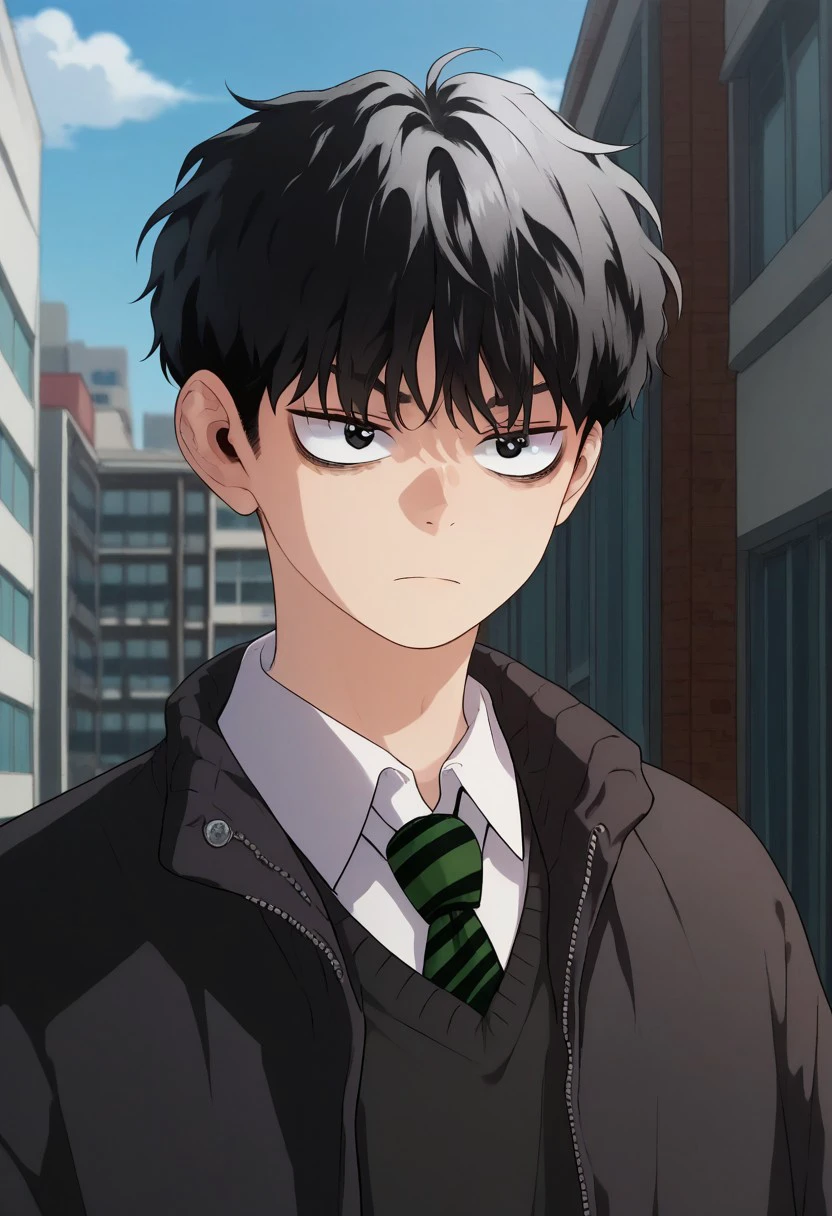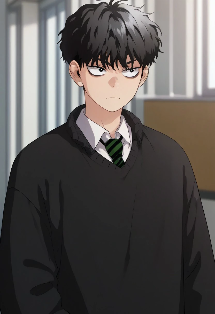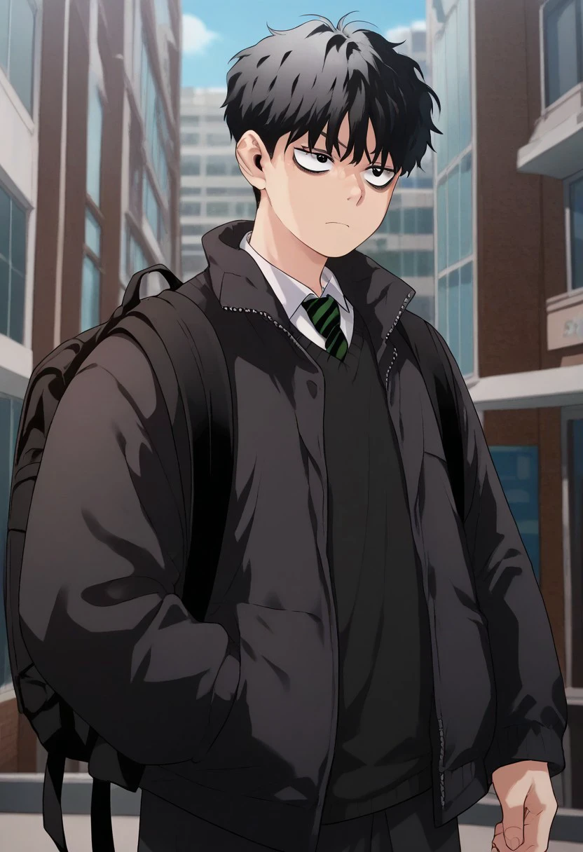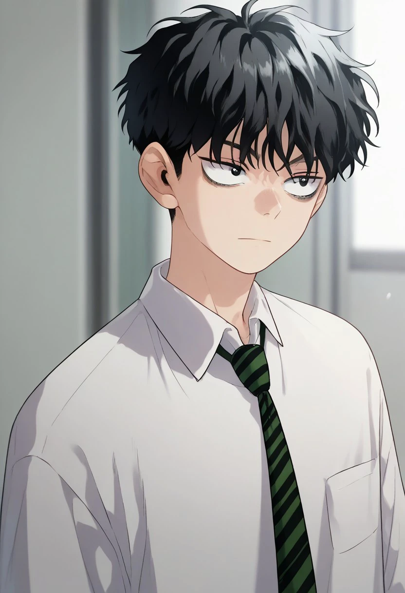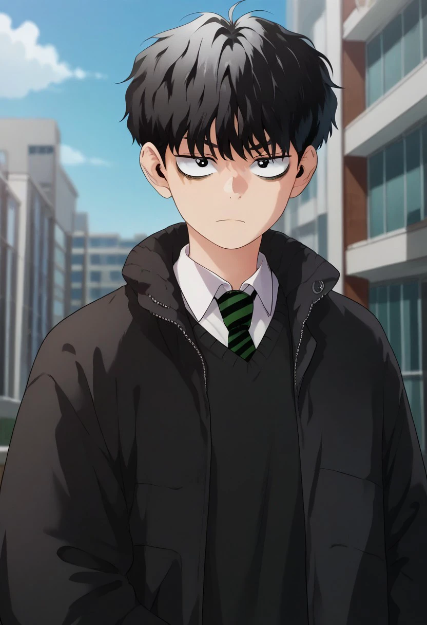 Yongjin, 1boy, male focus, solo, black hair, short hair, black eyes, bags under eyes, school uniform, shirt, collared shirt, white shirt, necktie, green necktie, striped necktie, sweater, black sweater, jacket, black jacket, pants,