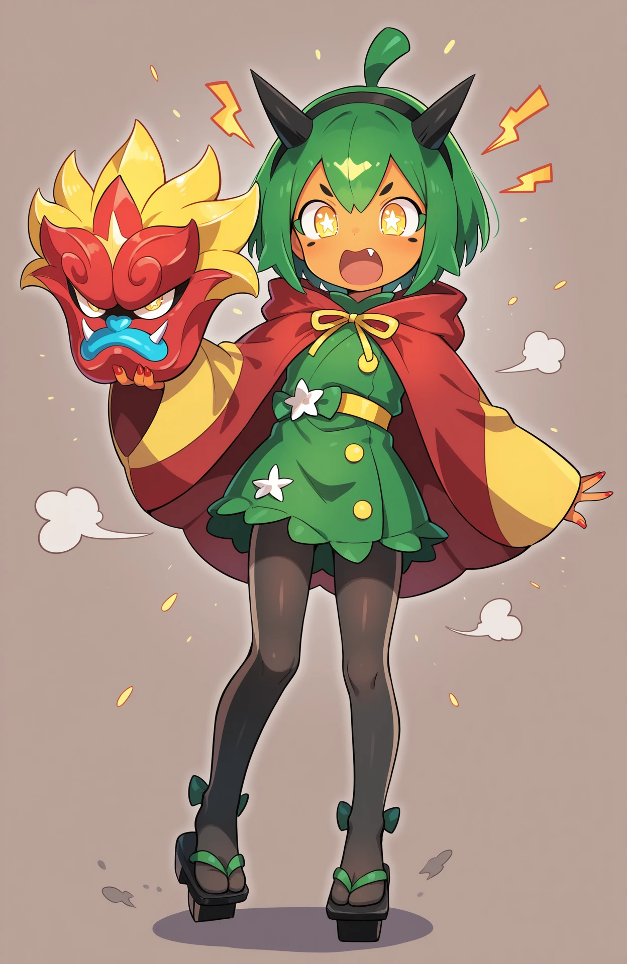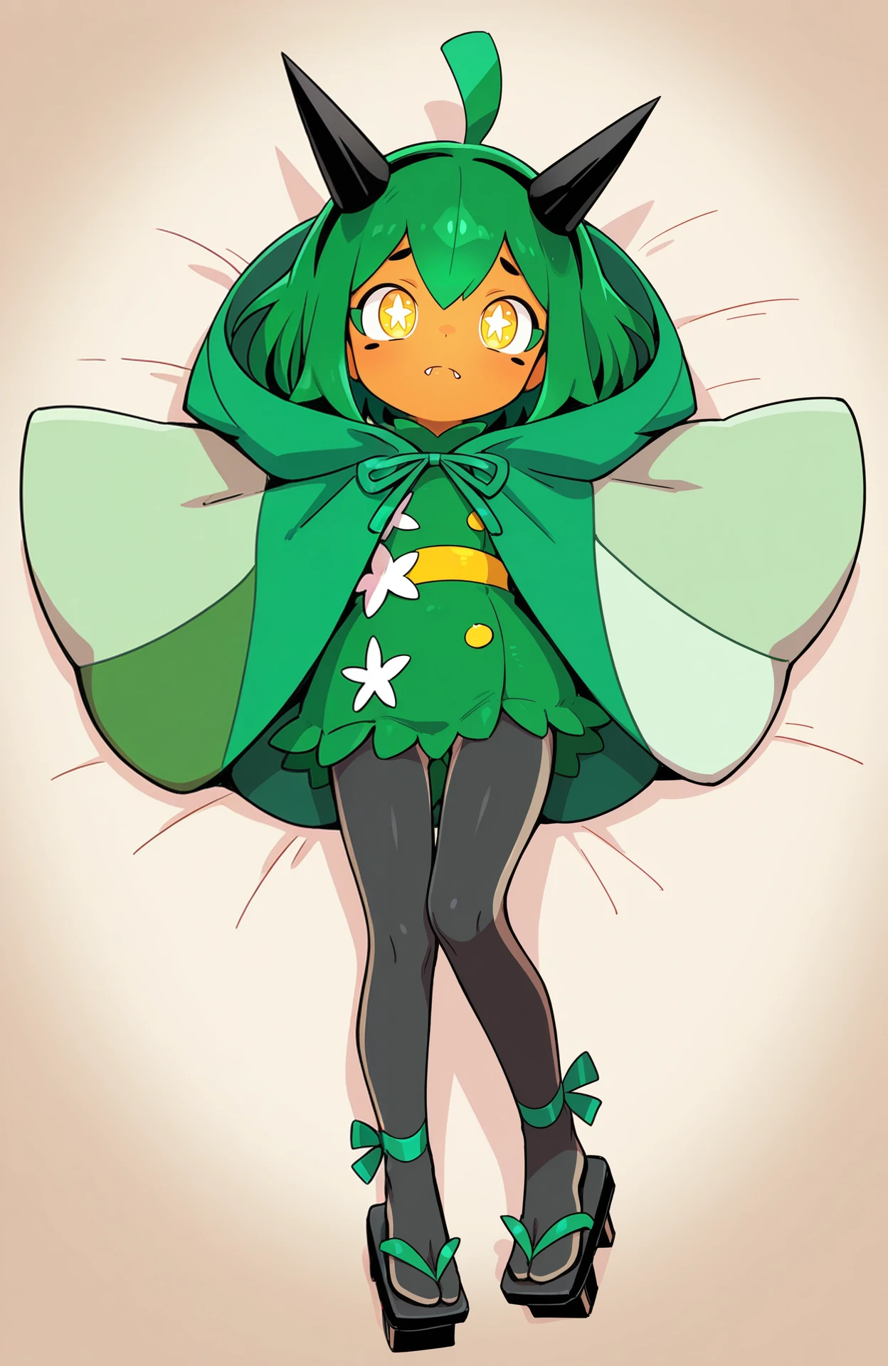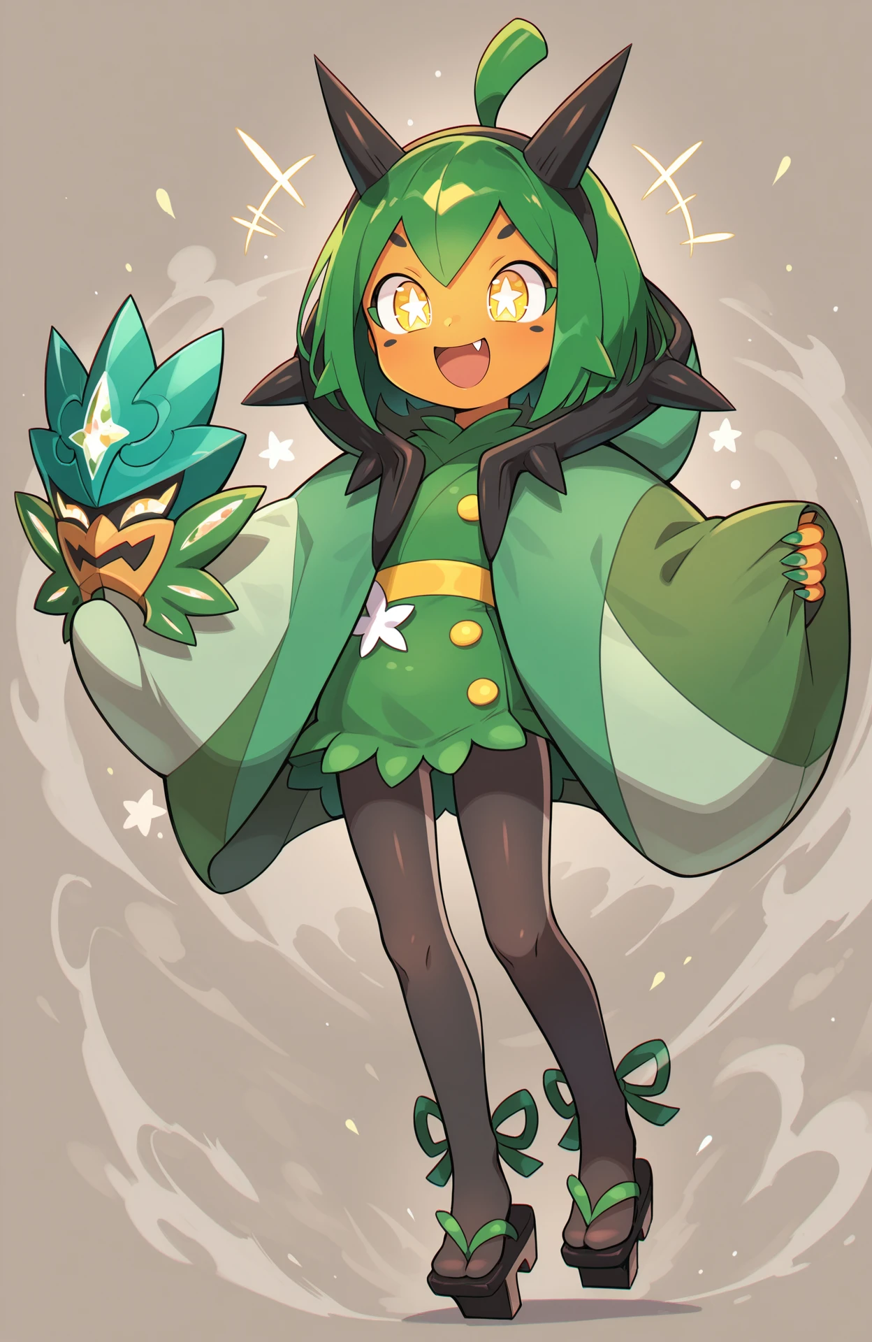 Gijinka Tags: ogerpon, black horns, yellow eyes, star-shaped pupils, bright pupils, fan