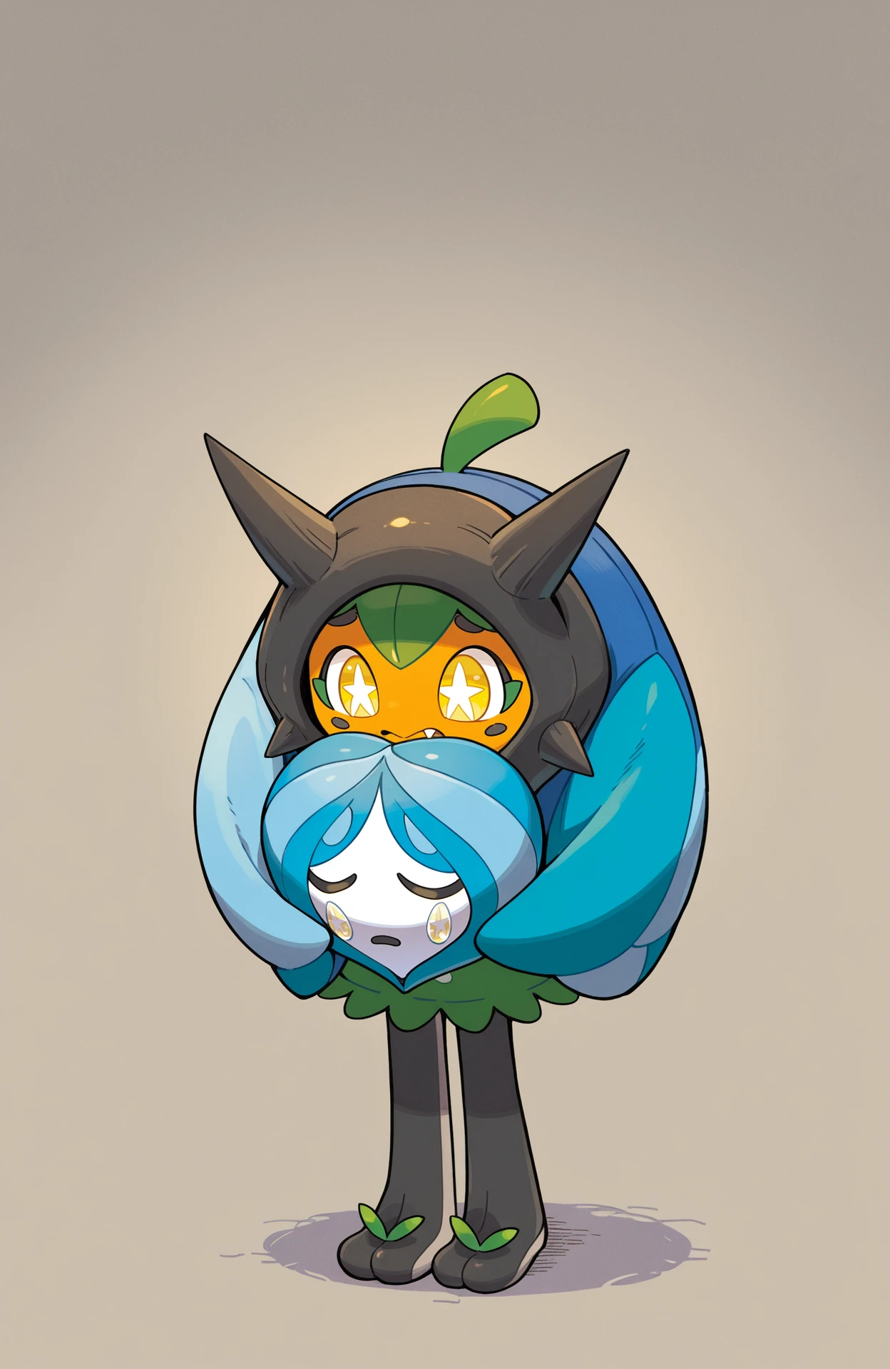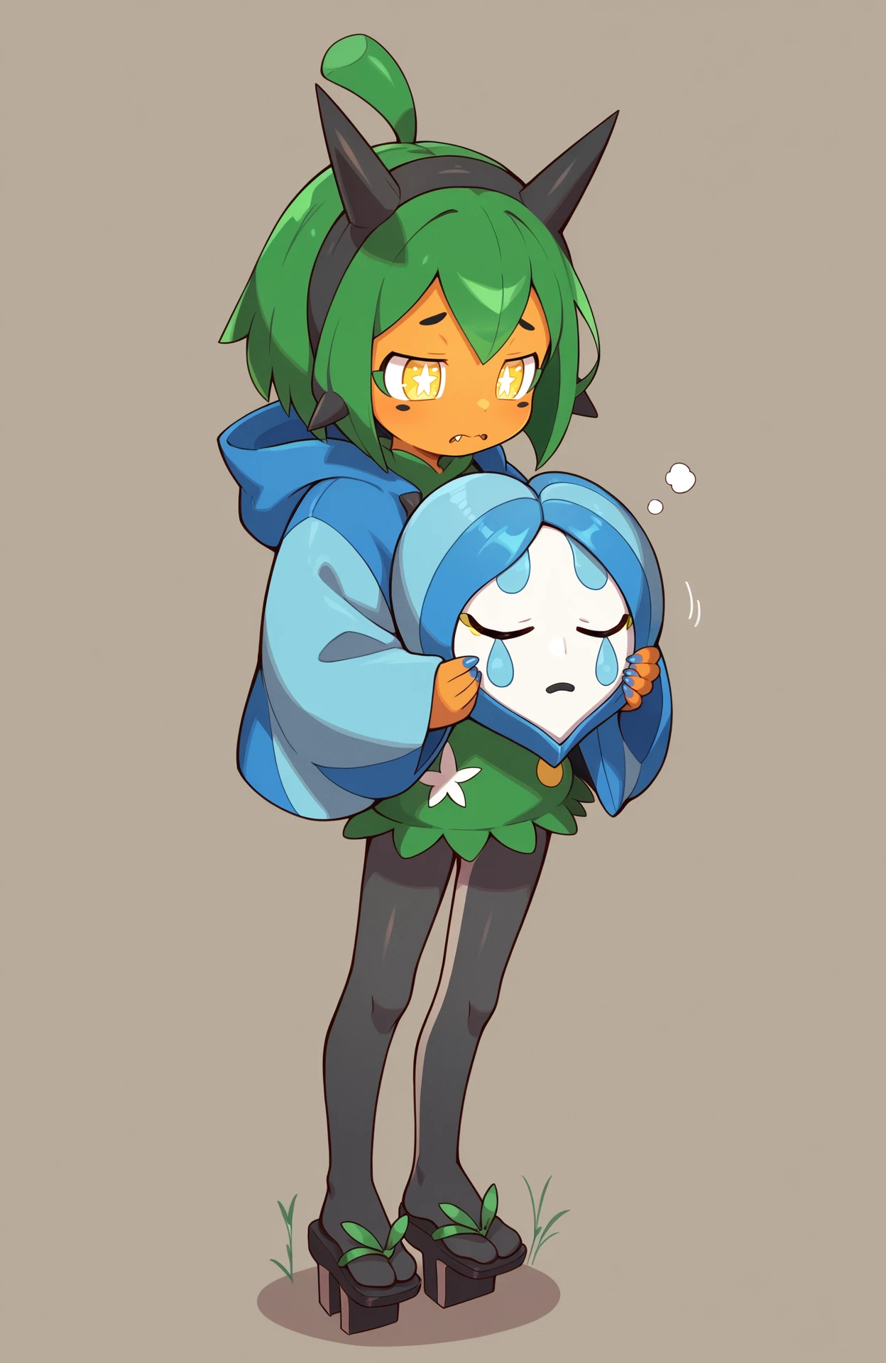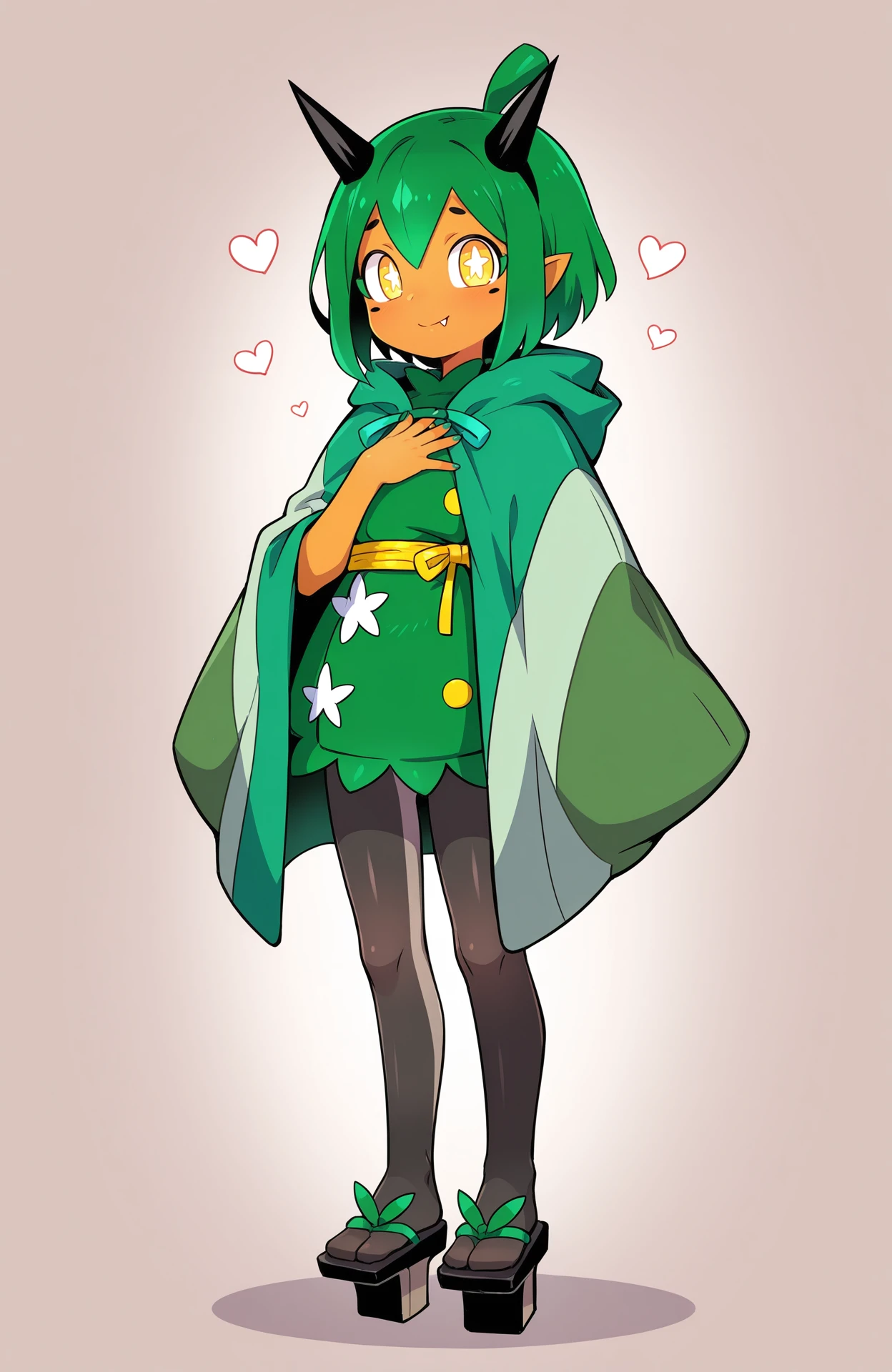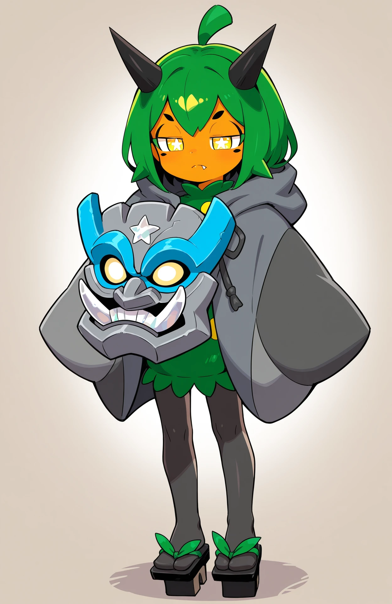 Gijinka Tags: ogerpon, black horns, yellow eyes, star-shaped pupils, bright pupils, fan