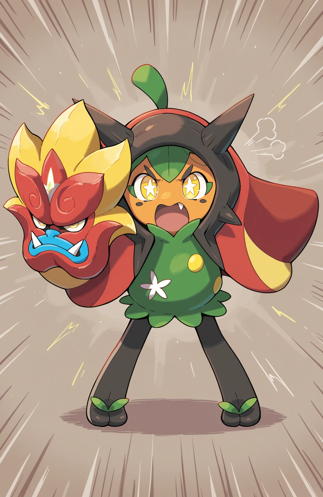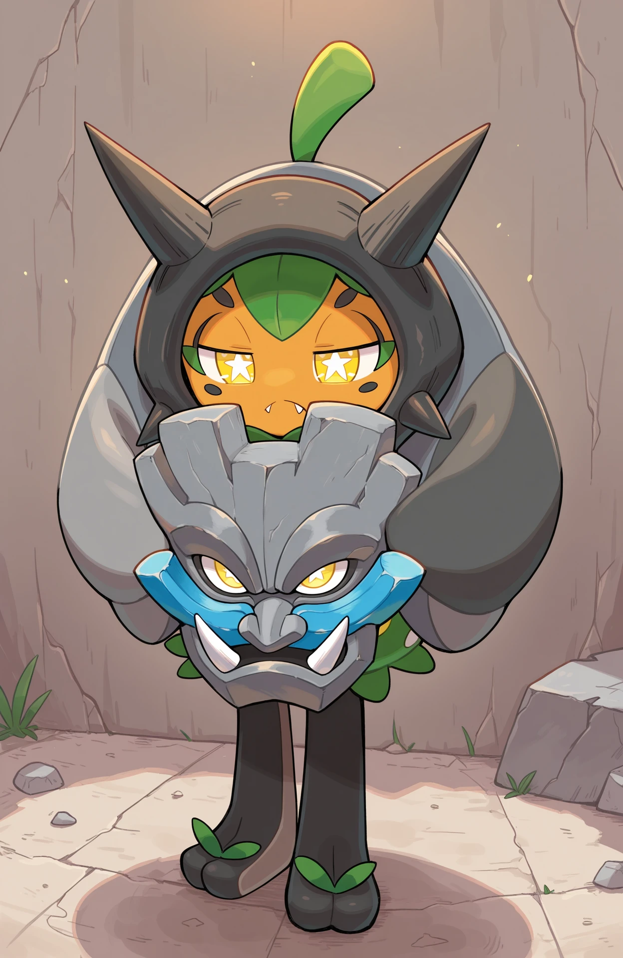 ogerpon, black horns, yellow eyes, star-shaped pupils, bright pupils, fangs
