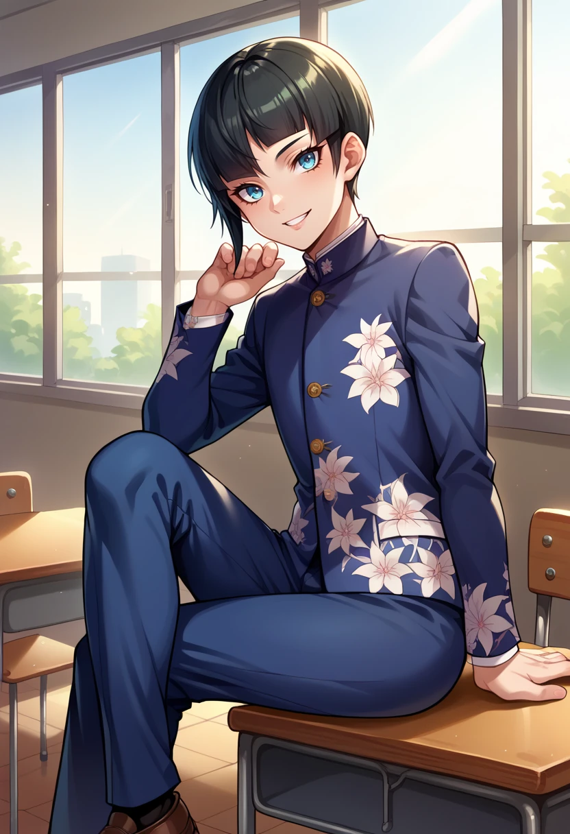smtvprotag, bob cut, blunt bangs, black hair, blue eyes, school uniform, blue pants, floral print, long sleeves, single sidelock