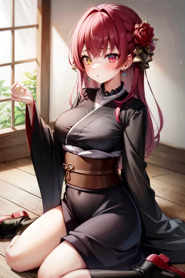 "houshouGothic, heterochromia, red eyes, yellow eyes, twintails, black ribbon, large breasts, mini top hat, hat flower, gothic lolita, short dress, red dress, frilled dress, detached sleeves, frilled sleeves, corset, bowtie, black gloves, pocket watch, white thighhighs"