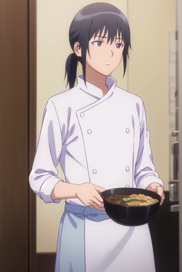 masahiro adachi, black hair, (brown eyes:1.3), ponytail, male focus,