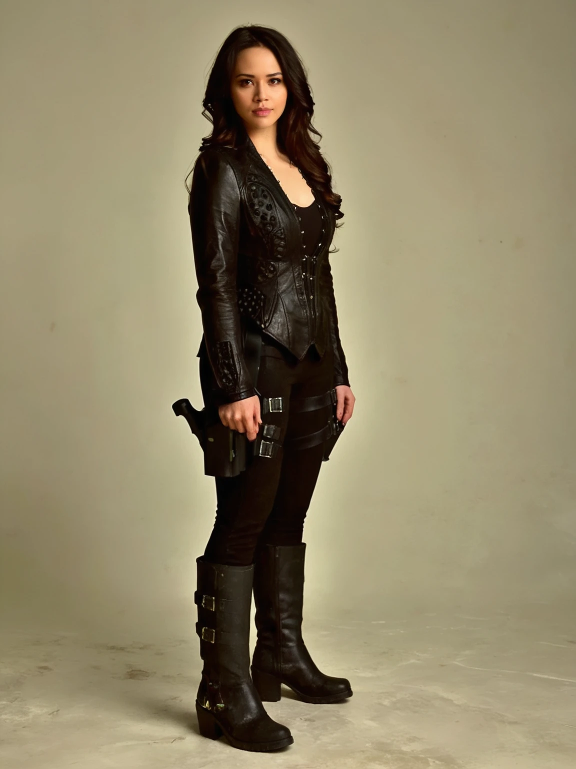 long hair,short jacket,pants,black straped boots,holster, (negative: short top,belly)