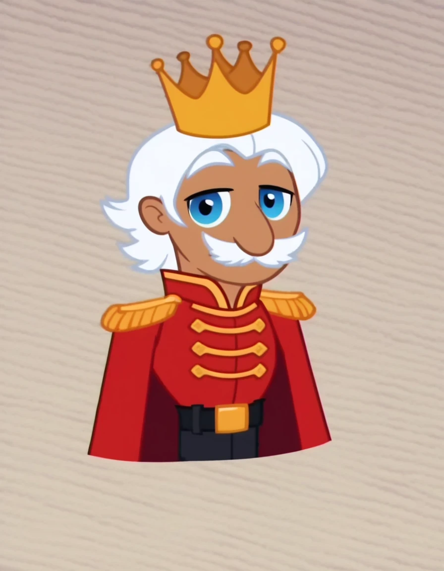 King_StrongbottomSML, blue eyes, long sleeves, 1boy, white hair, belt, cape, crown, epaulettes, white mustache, red outfit underneath black shirt, king, yellow crown, tan skin