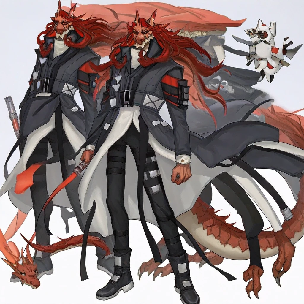 Wushu, dragon, red scales, long red hair, animal ears, horns, yellow eyes, white jaw, two black lines from eyes to jaw, thick tail, serious expression,