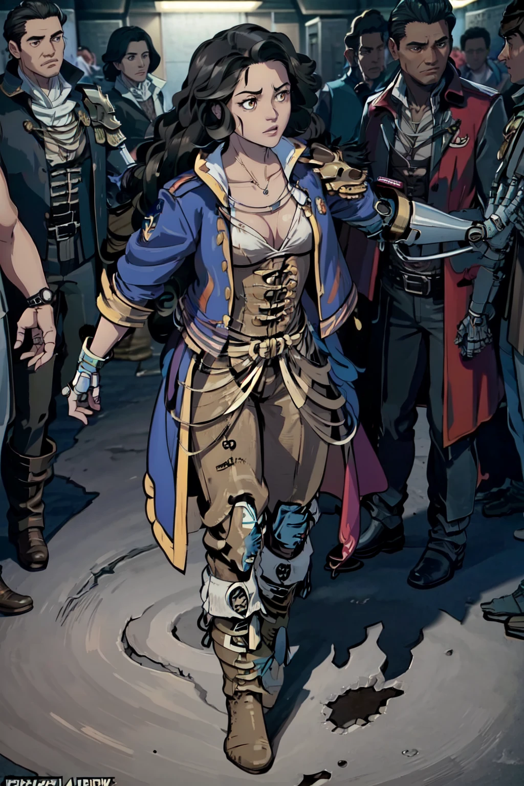 Jae from Rogue Trader. Prompt is "JaeRT", with "Armor,cape,single mechanical arm" for her look.