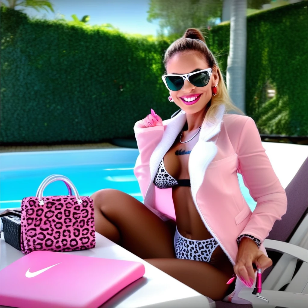It depicts a woman with a chest tattoo enjoying herself at the pool.