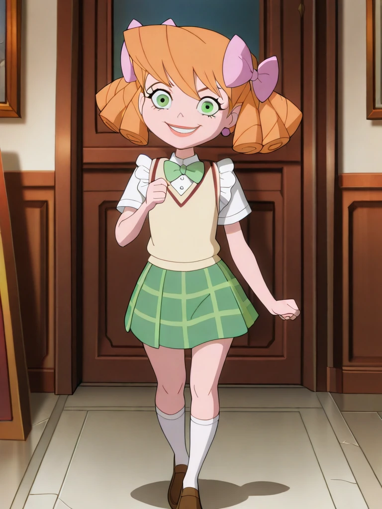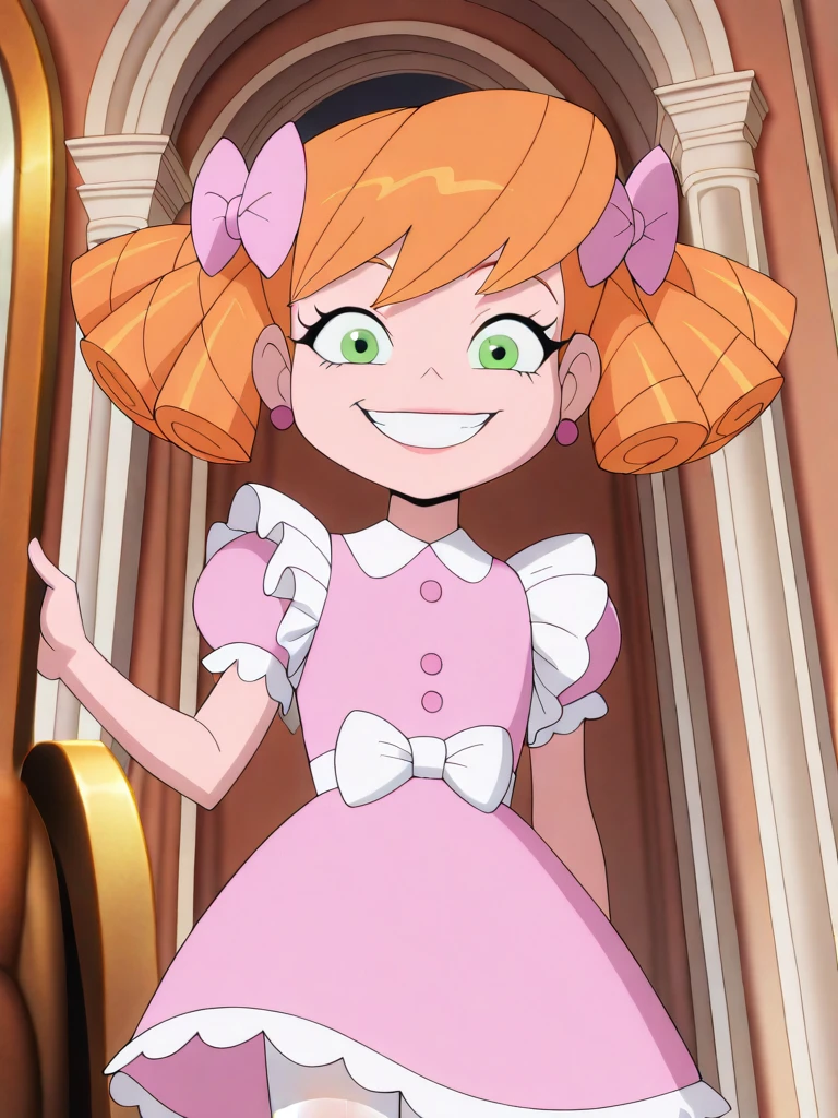 Prompt: mdahlil, lips, green eyes, orange hair, hair bow, pink bow, jewelry, earrings, pink dress, white waist ribbon, white pantyhose, pink shoes