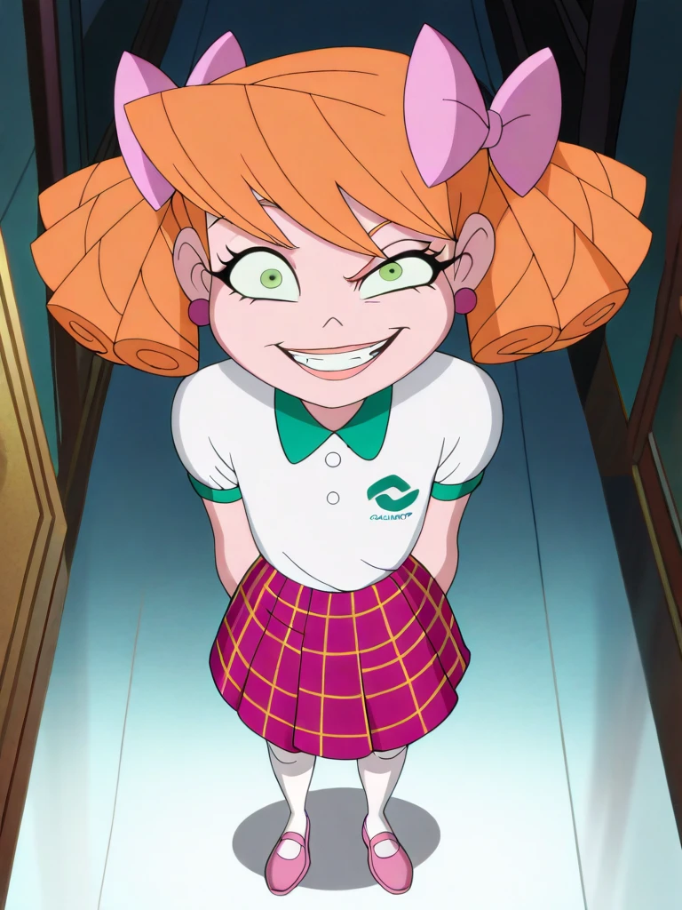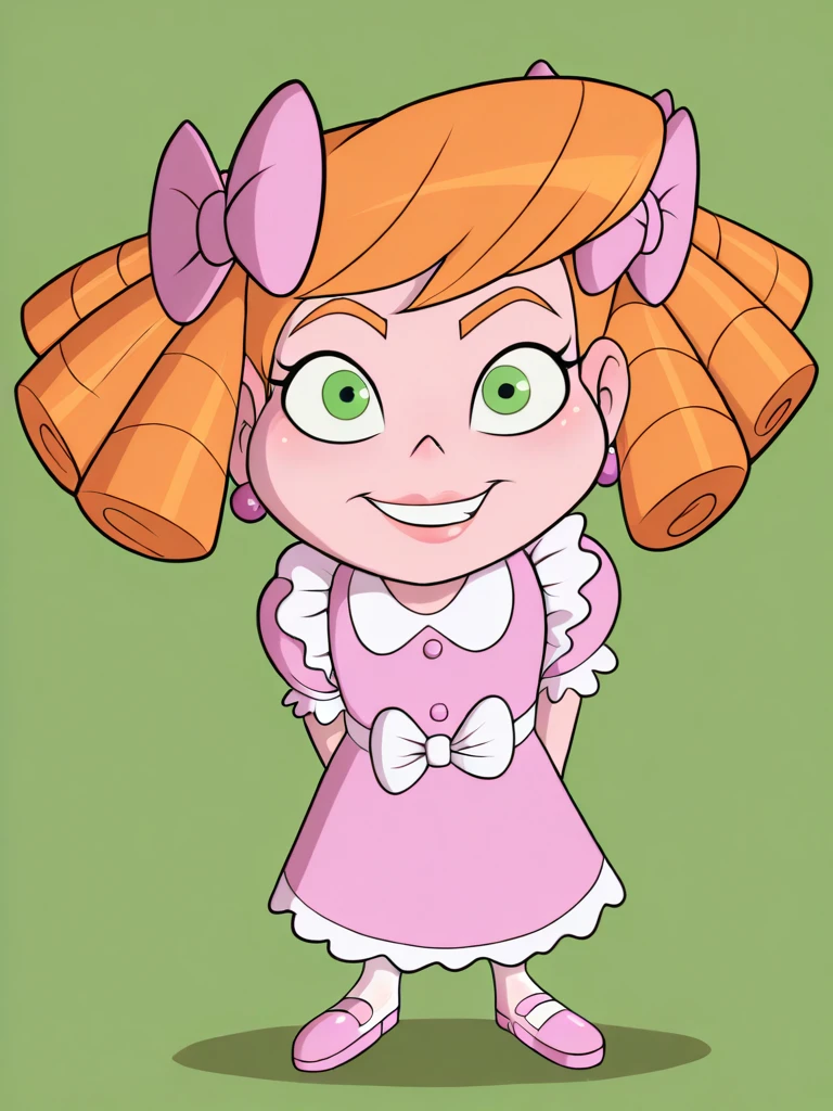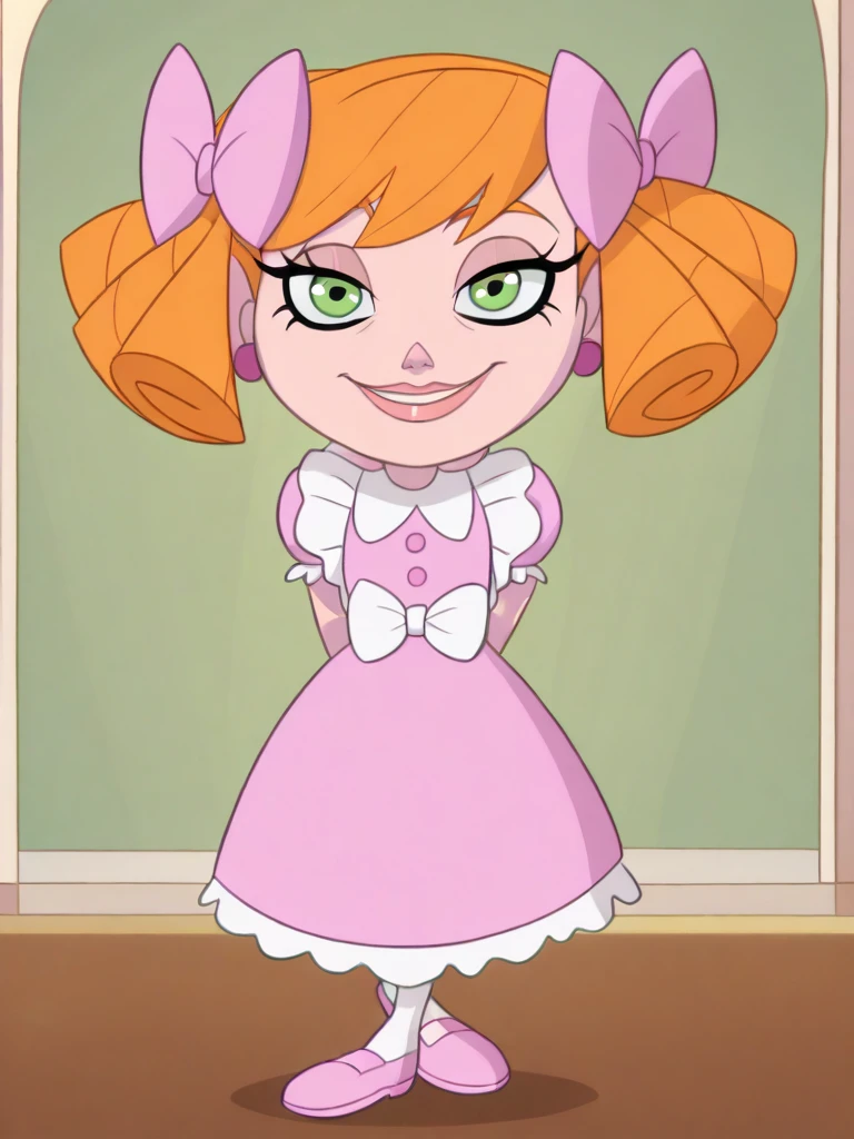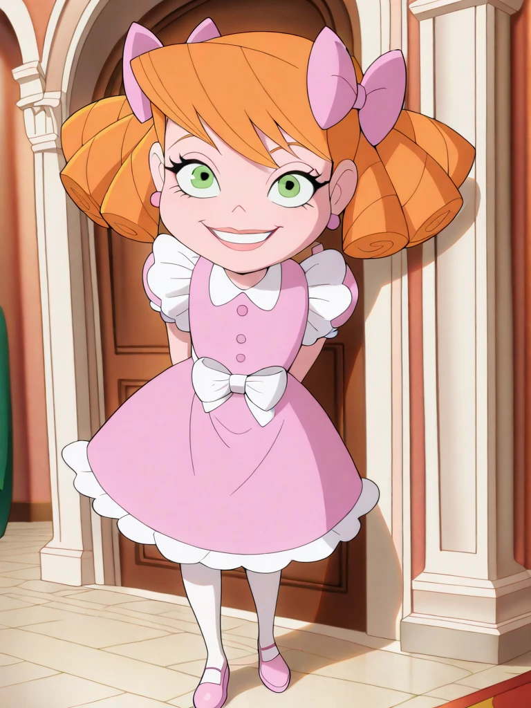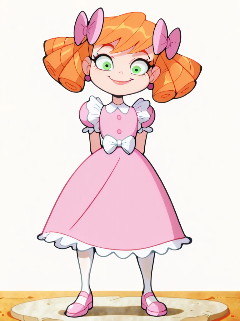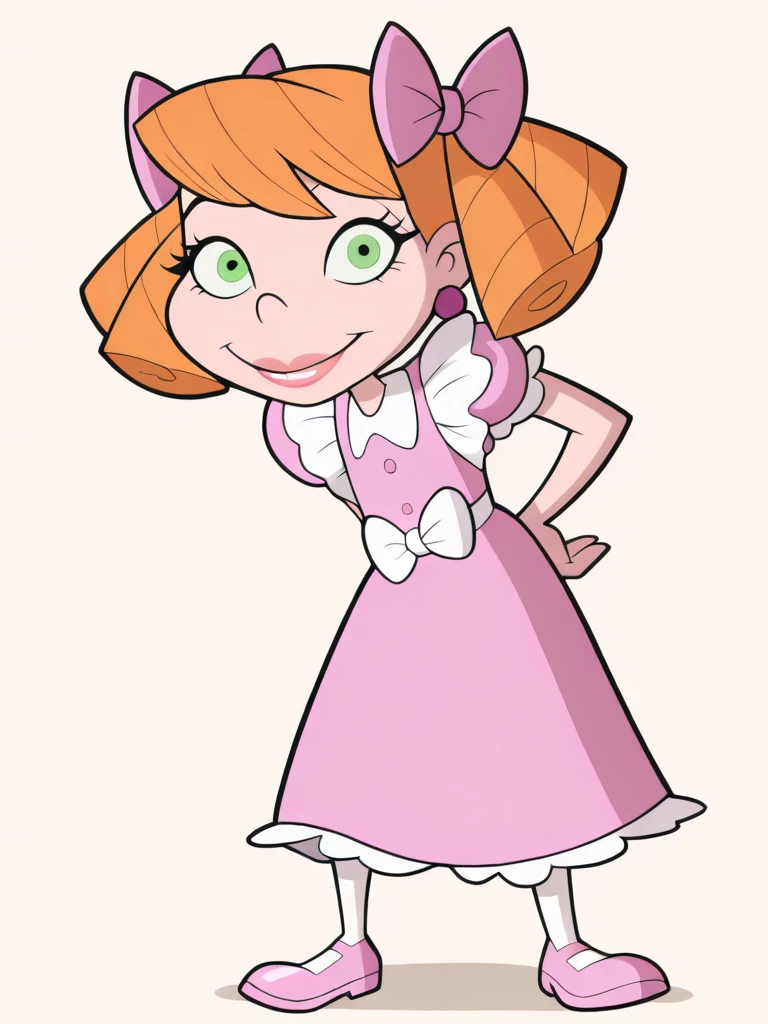 mdahlil, lips, green eyes, orange hair, hair bow, pink bow, jewelry, earrings, pink dress, white waist ribbon, white pantyhose, pink shoes
