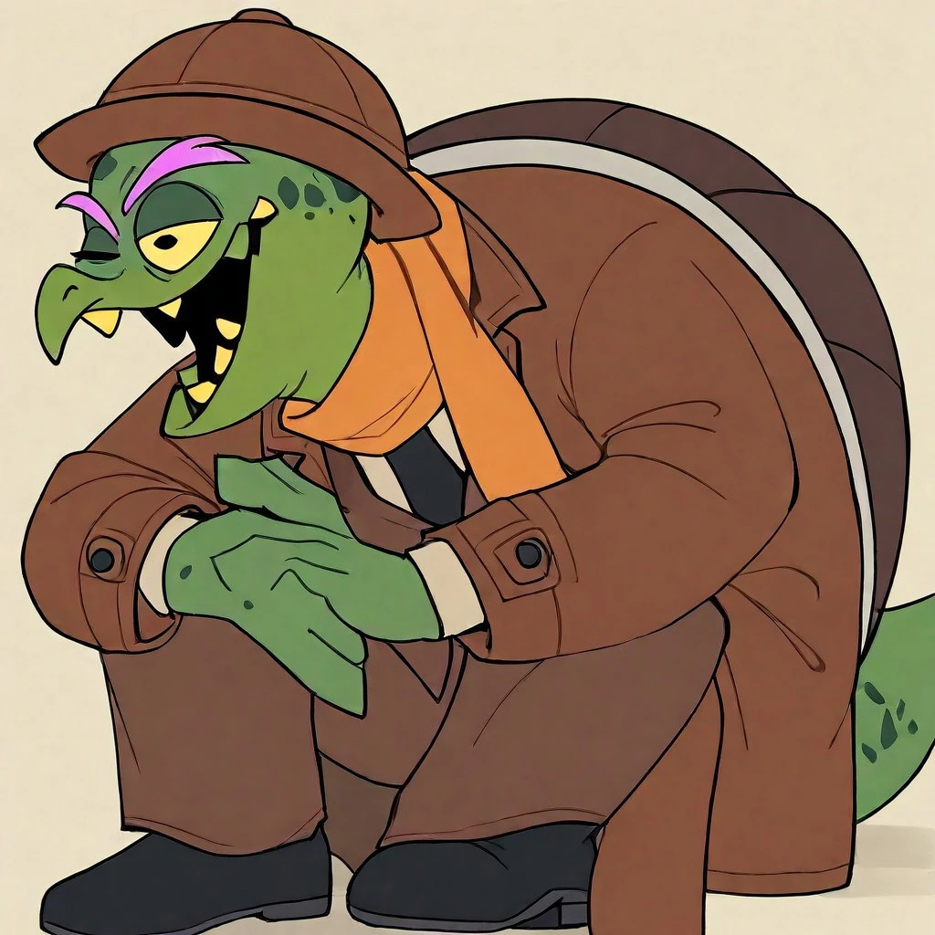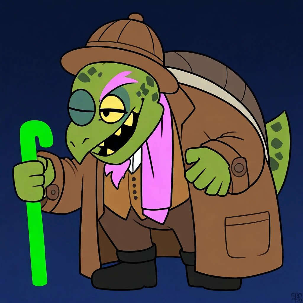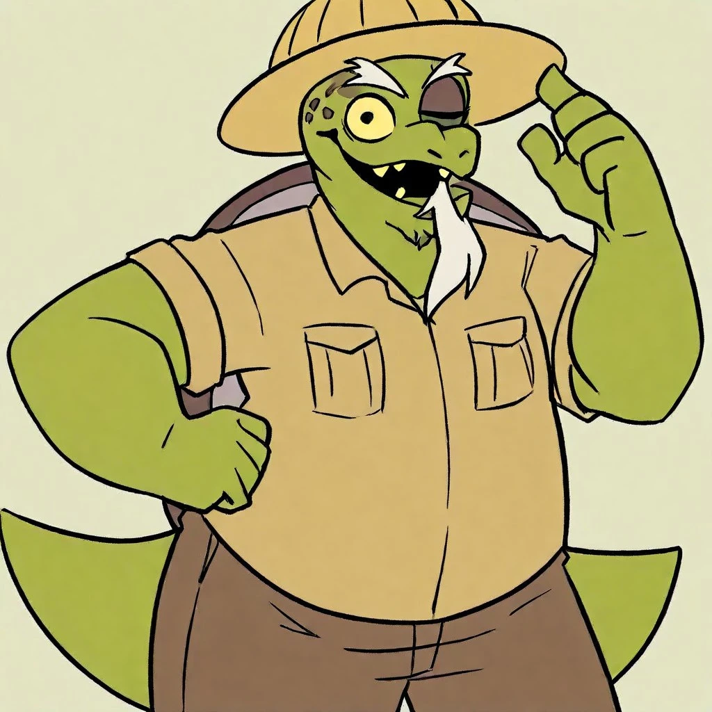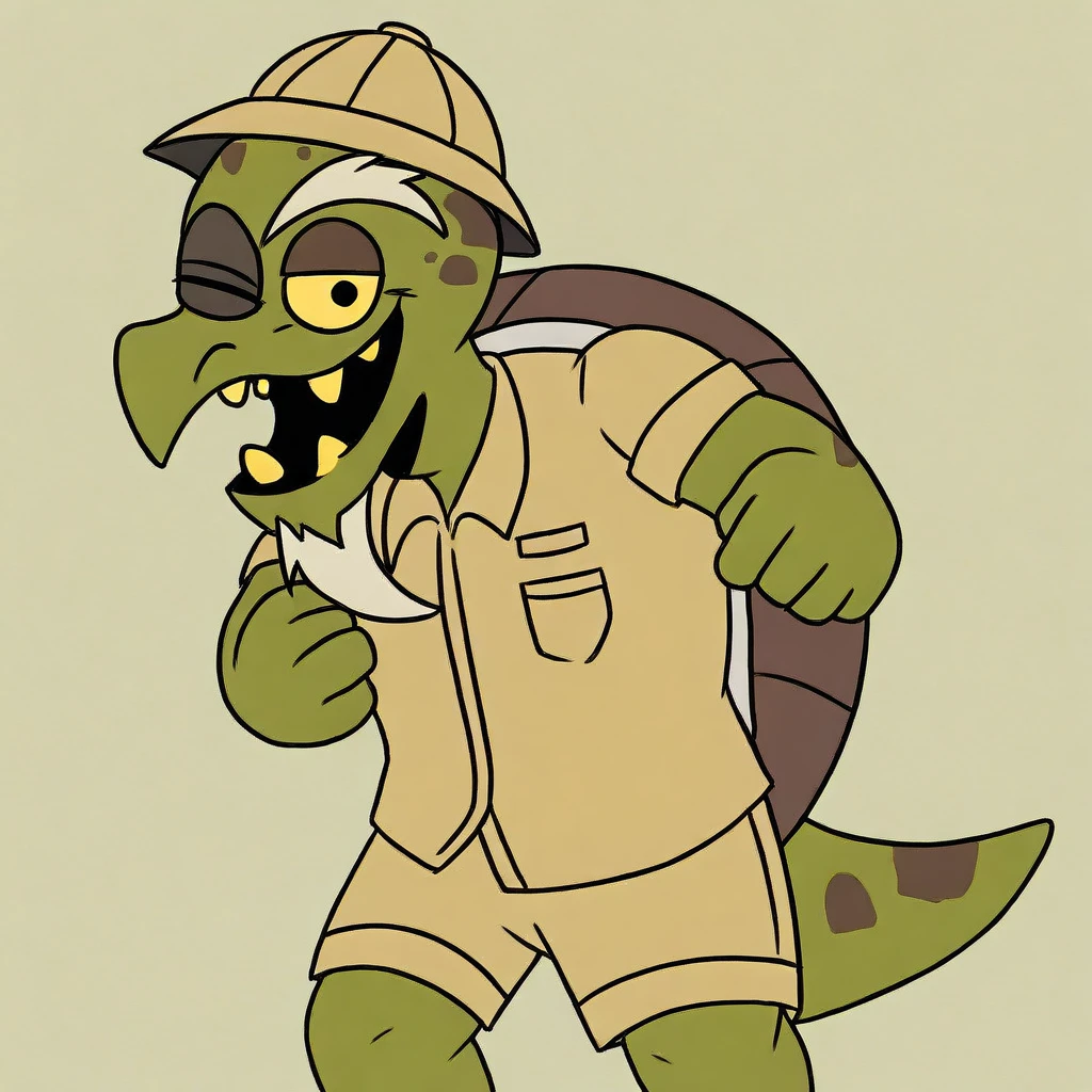 Gerson, solo, olive green tortoise, olive green skin, yellow sclera, black eyes, thick eyebrows, sharp yellow teeth, few teeth, older male, tan headwear, explorer outfit, tan collared shirt, shirt pocket, tan shorts, white hair, facial hair, one eye closed, goatee, brown turtle shell on back, necktie, scarf, brown coat, white undershirt, brown shirt, green cane, turtle shell on back, green skin, pink goatee, brown headwear, brown pants, black footwear, holding weapon, grey arm armor, grey armor, grey feet armor, chest armor, black bottom wear, pauldrons, turtle shell armor, long strand of pink hair, pink eyebrows, turtle tail