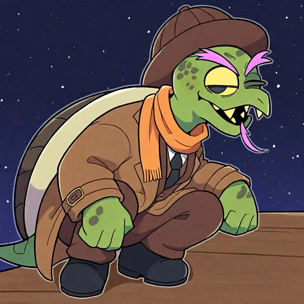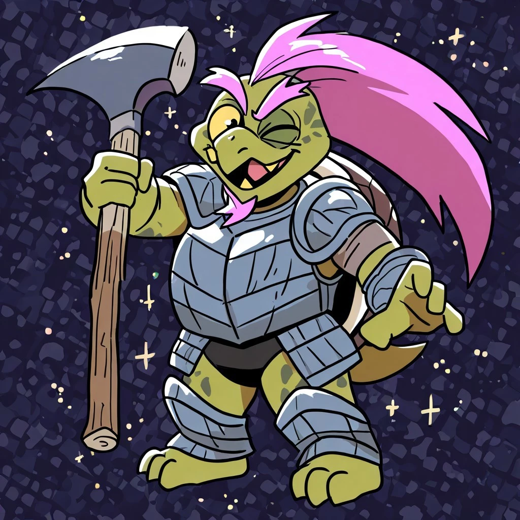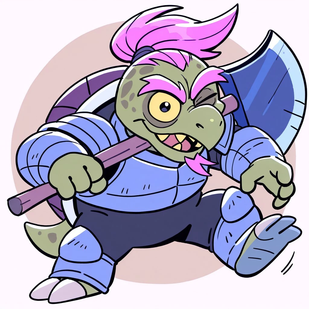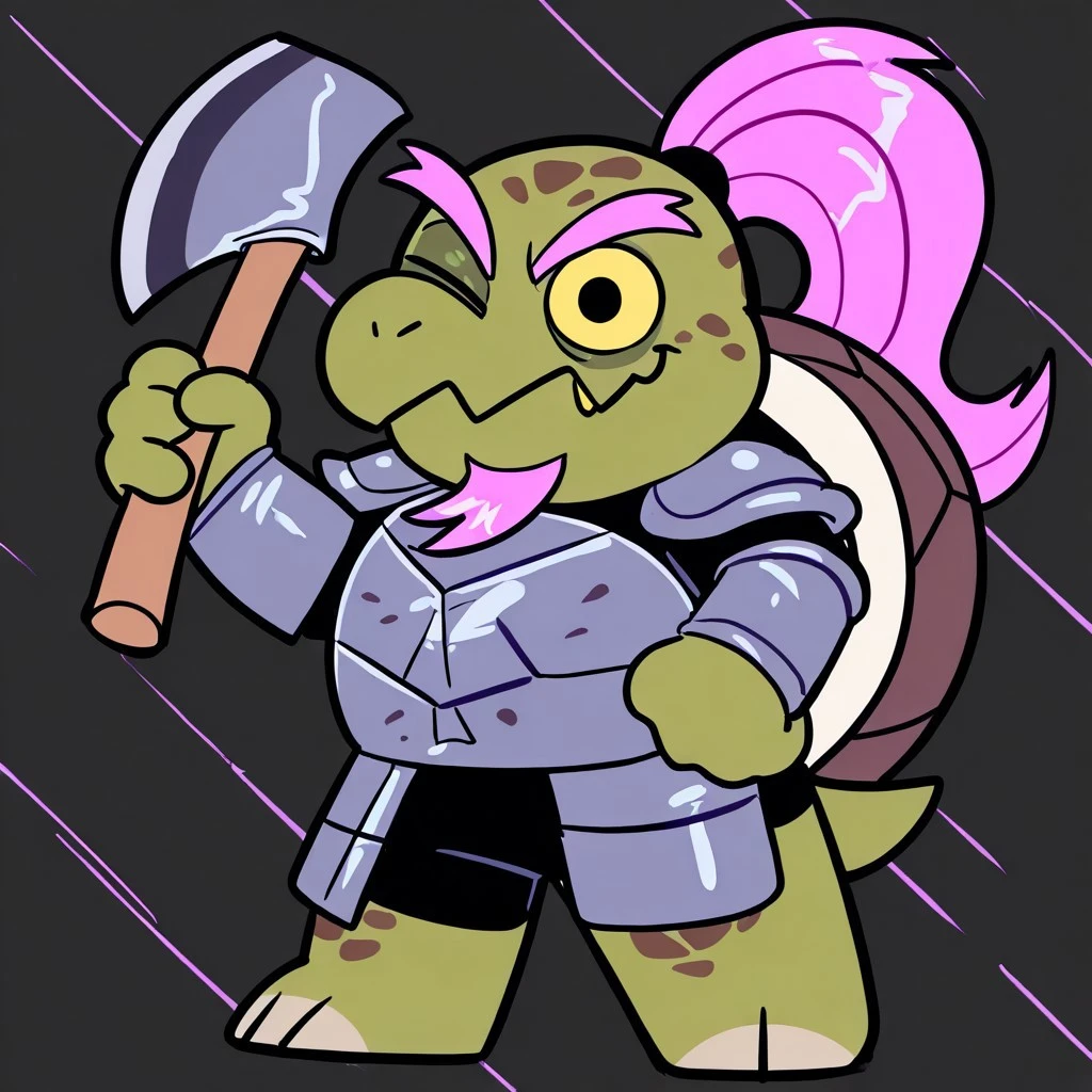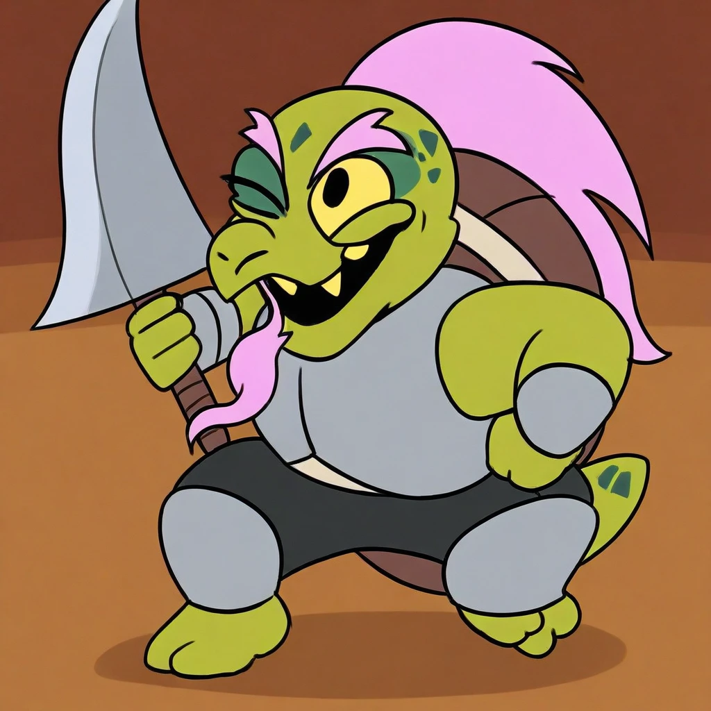 Gerson, solo, olive green tortoise, olive green skin, yellow sclera, black eyes, thick eyebrows, sharp yellow teeth, few teeth, older male, tan headwear, explorer outfit, tan collared shirt, shirt pocket, tan shorts, white hair, facial hair, one eye closed, goatee, brown turtle shell on back, necktie, scarf, brown coat, white undershirt, brown shirt, green cane, turtle shell on back, green skin, pink goatee, brown headwear, brown pants, black footwear, holding weapon, grey arm armor, grey armor, grey feet armor, chest armor, black bottom wear, pauldrons, turtle shell armor, long strand of pink hair, pink eyebrows, turtle tail