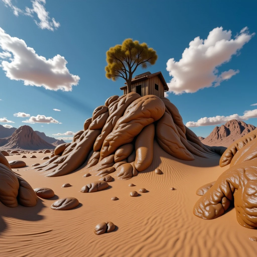 Big chocolate tentacles / roots in a sandy desert with rocks and mountains: