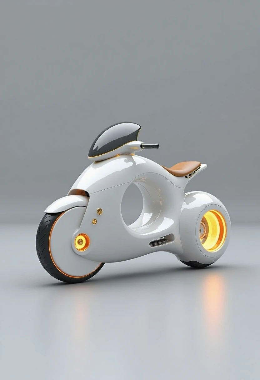 Futuristic vehicle design, three - wheeled bike with white frame, circular orange lights, against a plain gray backdrop, simple futurism.