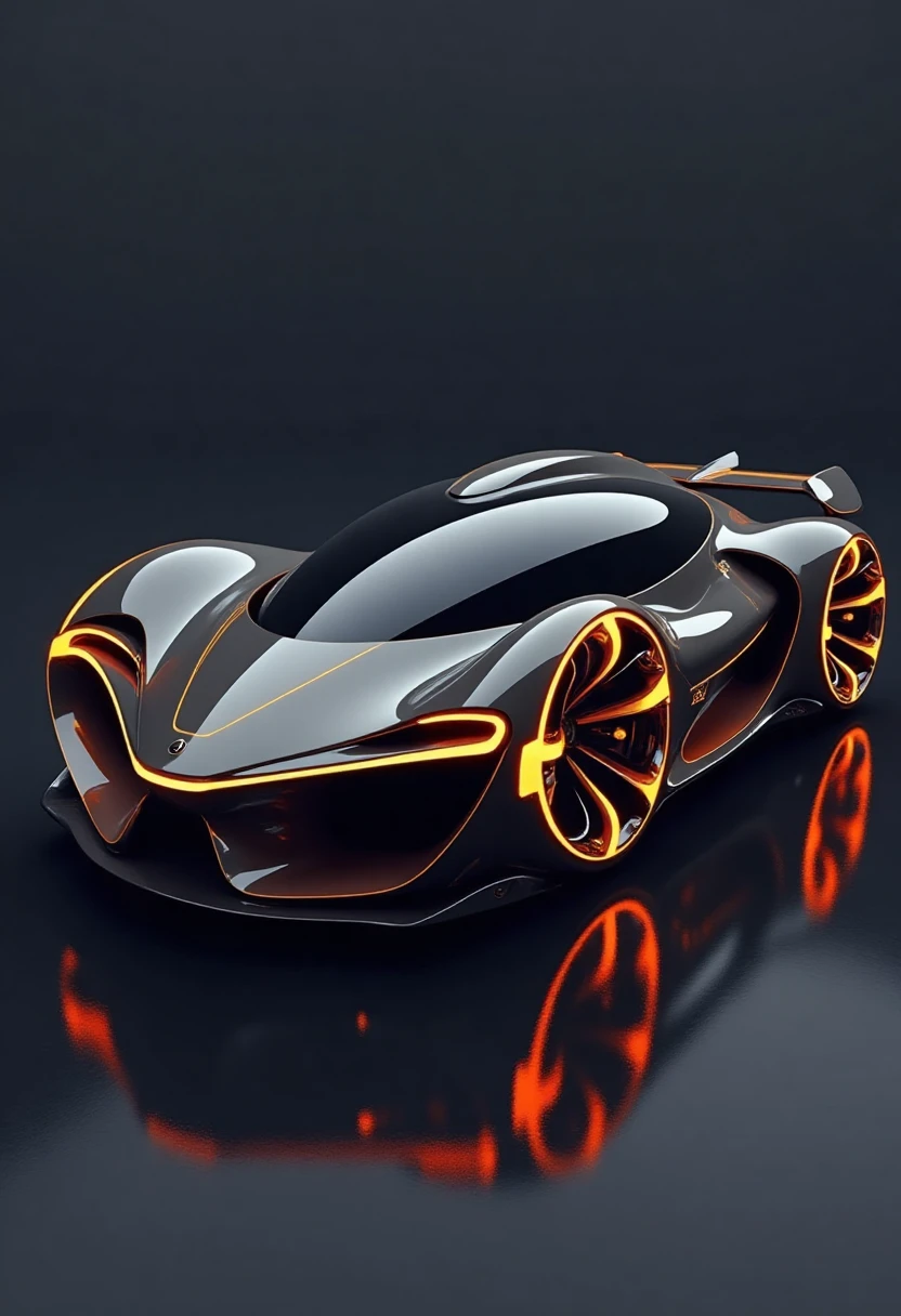 Futuristic vehicle design, sci - fi car with glowing orange lines, aerodynamic shape, on a reflective dark road, minimalist yet striking.
