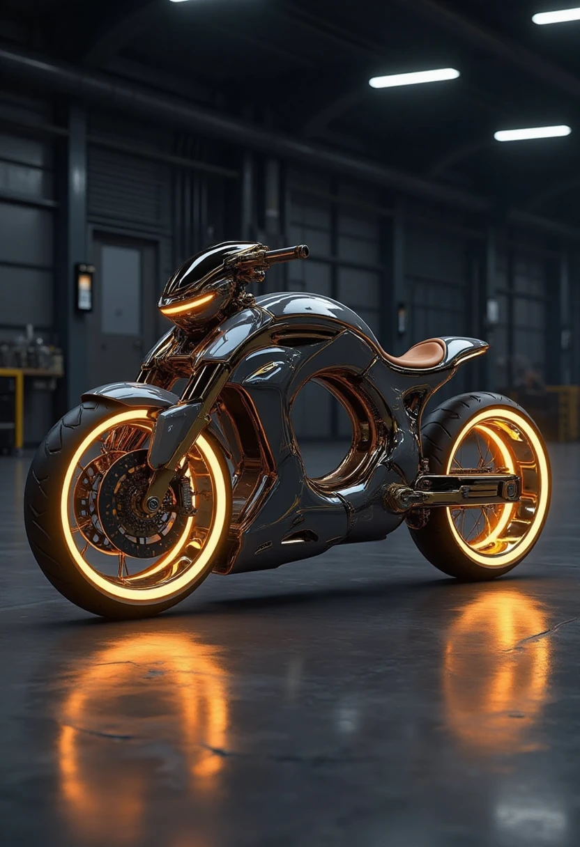 Futuristic vehicle design, sleek motorcycle with transparent wheels, neon - lit golden accents, set in a cyberpunk city background, high - tech and glossy.
