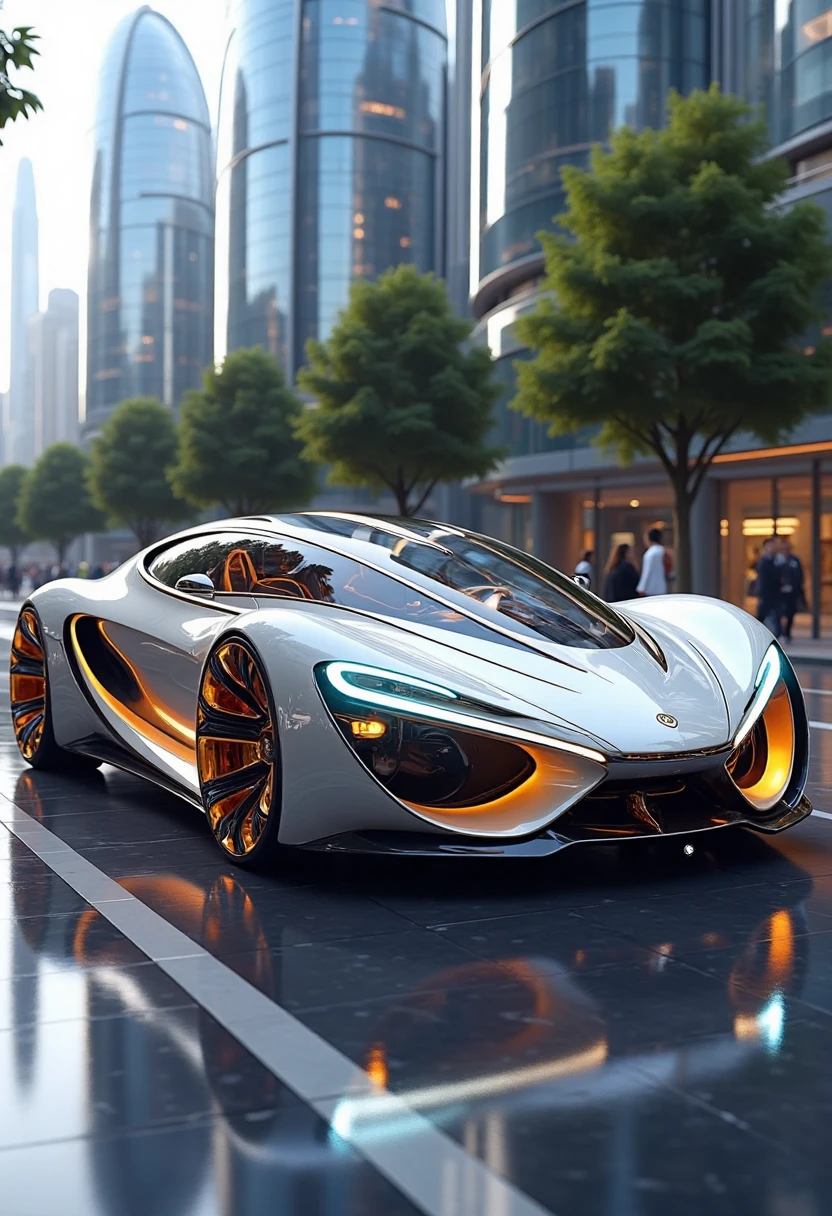 Futuristic vehicle design, luxury car with transparent panels, metallic sheen, on a high - tech city street, opulent and modern.