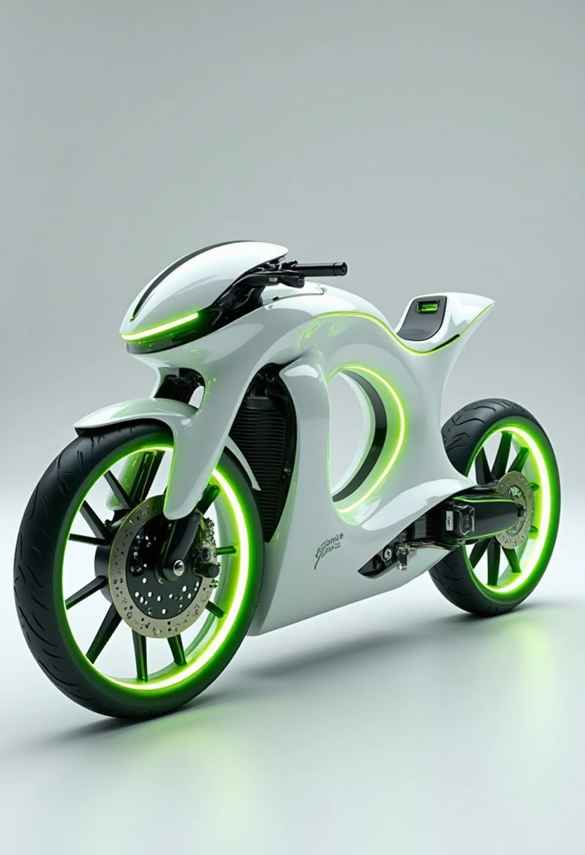 Futuristic vehicle design, advanced motorcycle with organic - like curves, green neon wheels, in a clean studio setting, bio - inspired.