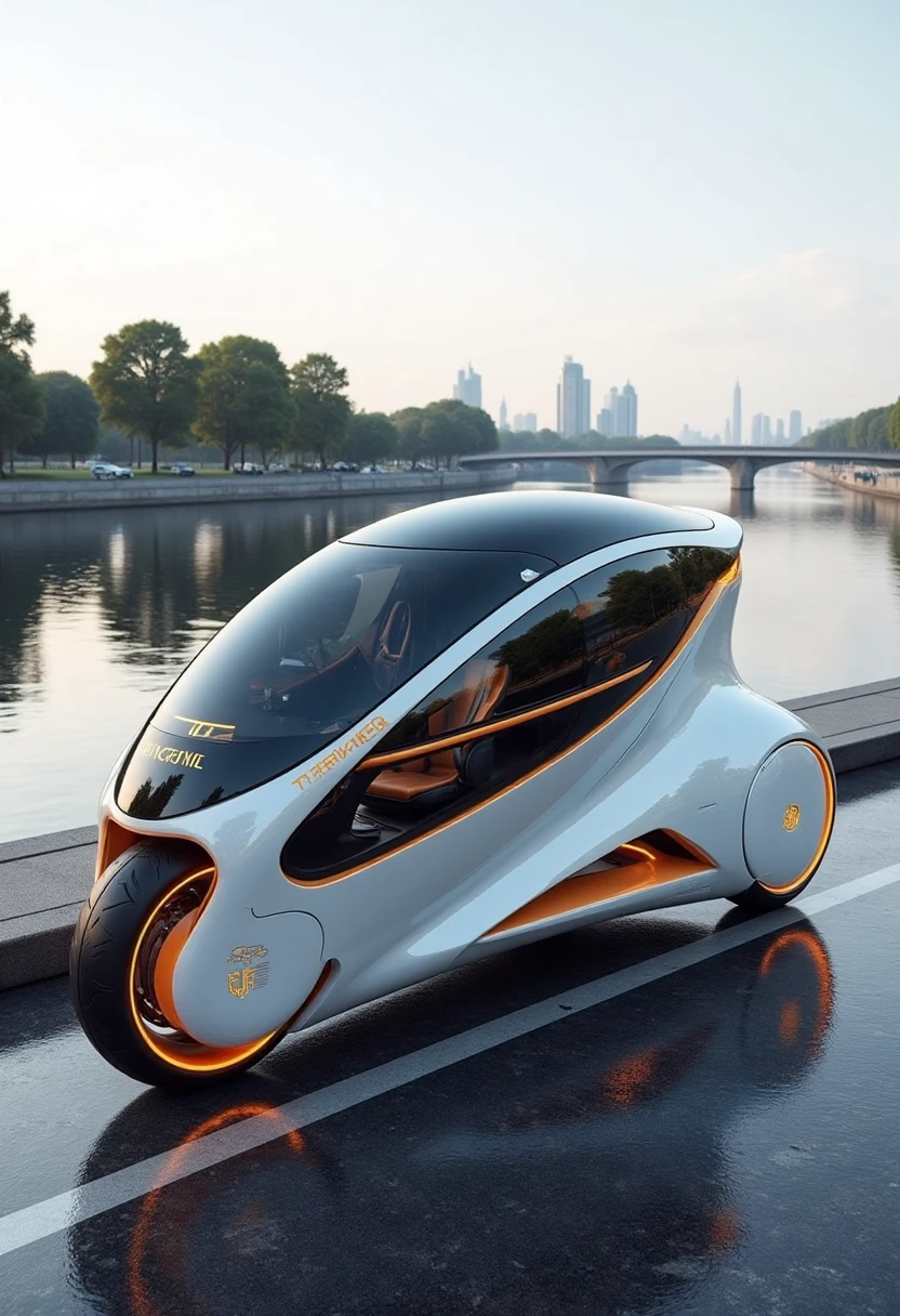 Futuristic vehicle design, small electric vehicle with “TIME” logo, orange accents, by a serene river, futuristic daily commute.