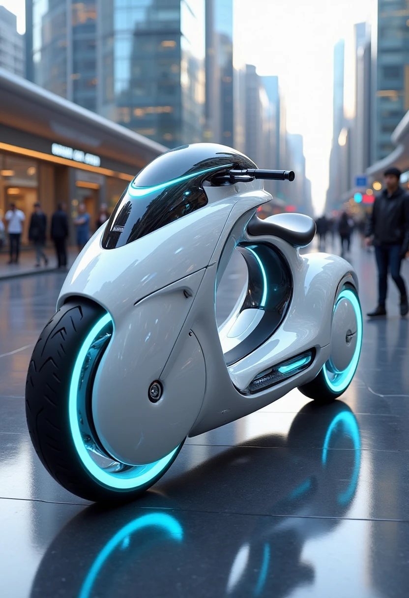 Futuristic vehicle design, advanced scooter with blue lights, sleek white, in a sci - fi megacity plaza, urban mobility.