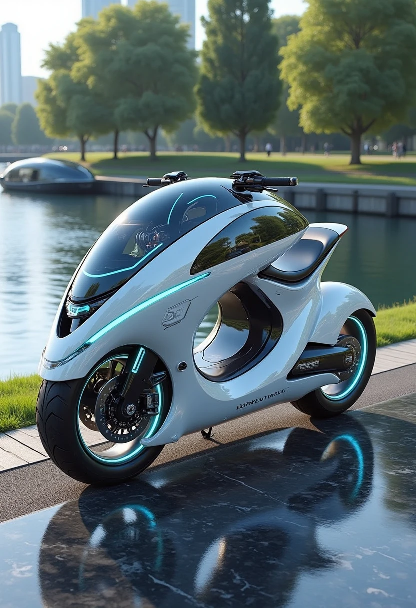 Futuristic vehicle design, compact scooter with curved body, blue - lit edges, near a futuristic riverbank, blending nature and tech.