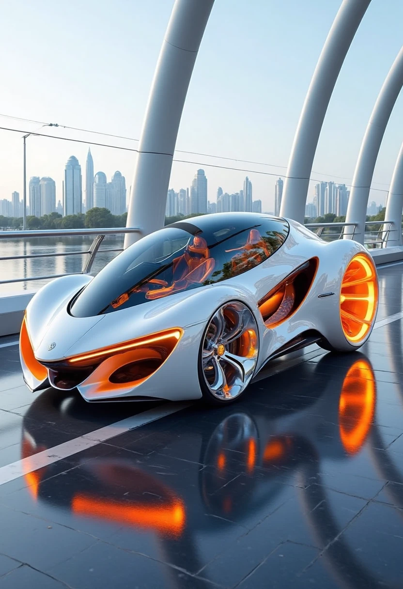 Futuristic vehicle design, high - speed bike with white body, neon orange rims, on a futuristic bridge, speed - oriented.