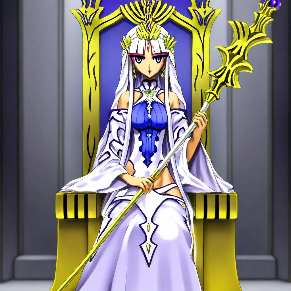 nina Viento, 1girl, solo, long hair, staff, dress, white hair, white dress, Purple eyes , magenta eyeshadow, royal outfit, makeup, pink lipstick, sidelocks, gold circlet, gold earrings, forehead jewel, bare shoulders, kimono sleeves, white dress, blue and white bodice, white collar, violet decorations, gold necklace, white opaque veil, breasts