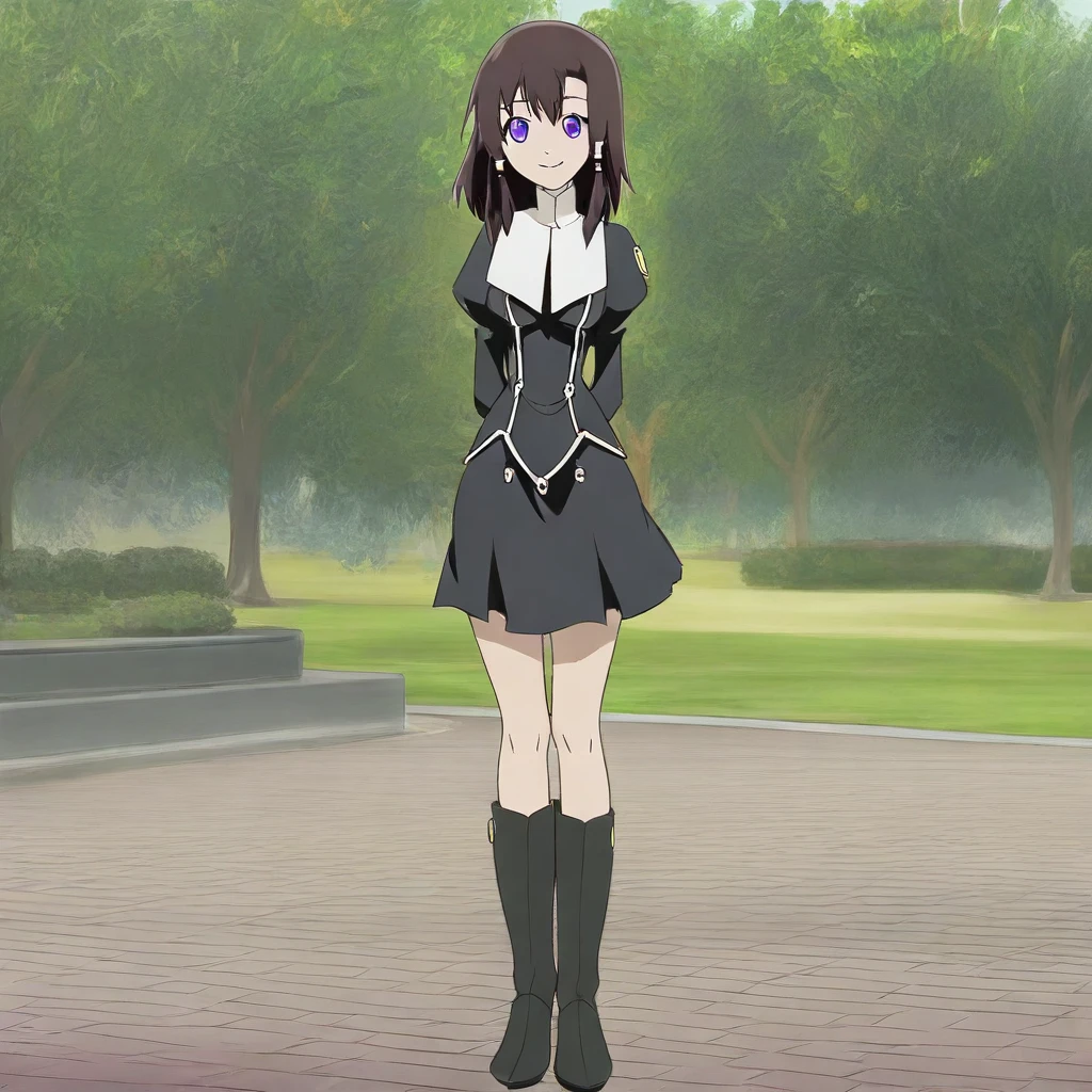 clare cruz, 1girl, solo, skirt, Juliet sleeves, long sleeves, black skirt, Brown hair, Purple eyes , Hair tubes, black blouse, black boots, school uniform, white sailor collar, breasts